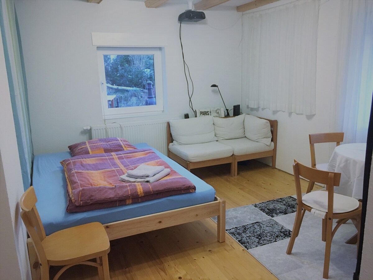 Modern apartment in a family house with separate entrance, terrace and garden. The Appartment / Studio is quietly located, not far from the A 7 and is located in a suburb of the district town of Aalen with good access to the public transport network. The studio has 35 sqm and is newly renovated and equipped. There is a bathroom, a kitchenette and a sleeping and dining area. It is very suitable for two adults and maybe a child, who by the way are very welcome. The third bunk is on the red sofa. For one night, this can also be used by an adult. The parking space for a car is located at the house, bicycles can be parked in a garden shed. The place under the apple tree invites you to linger in summer.