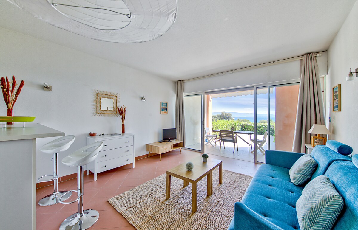 The air-conditioned apartment consists of a large main room with sofa bed, TV and an American kitchen equipped with a counter, you then have a bedroom, bathroom, separate toilet and sunny terrace.