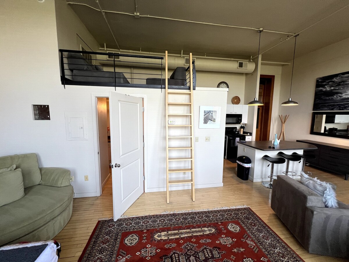 This bright and airy one bed, one bath has an updated kitchen with open shelving and modern recessed lighting to give it that urban-living meets farmhouse feel.