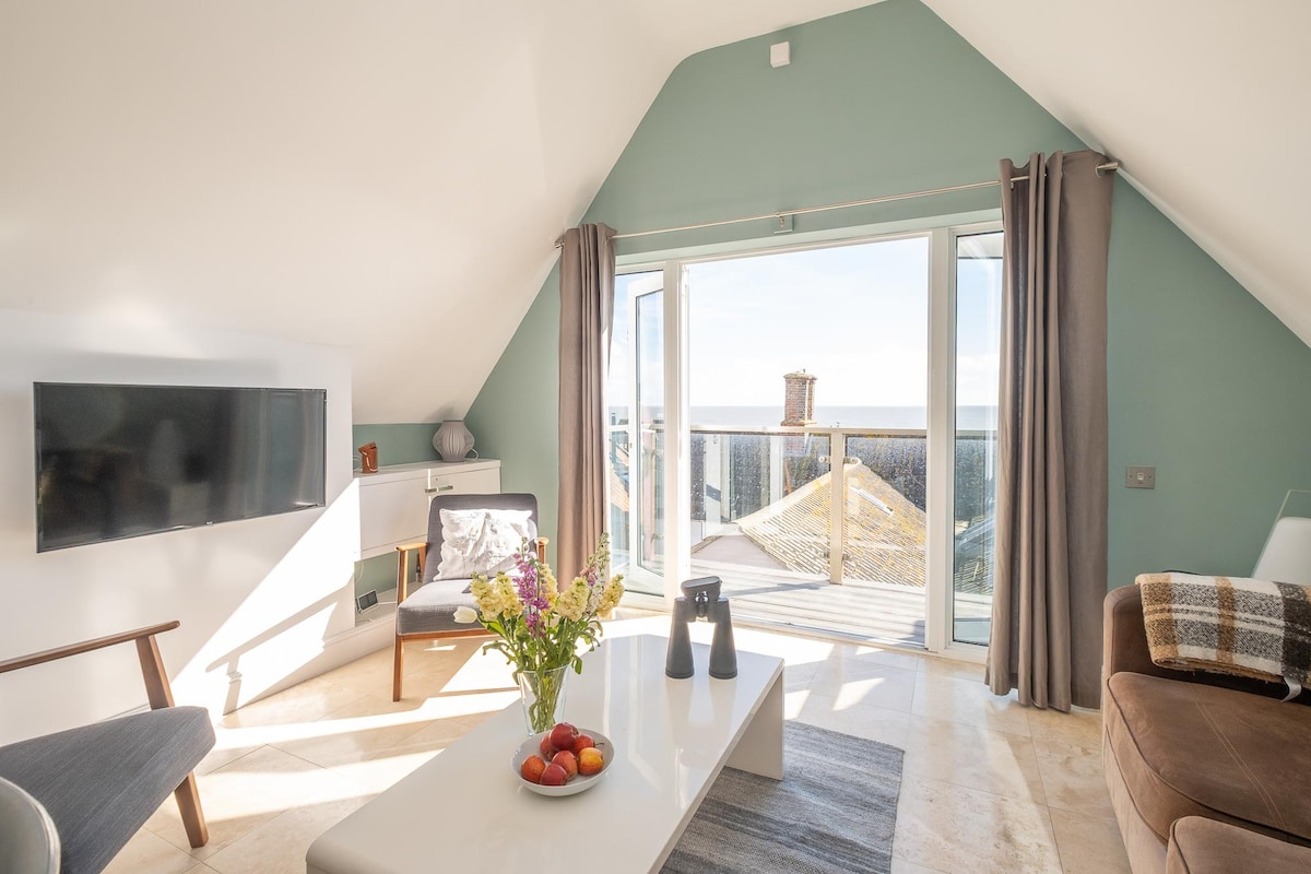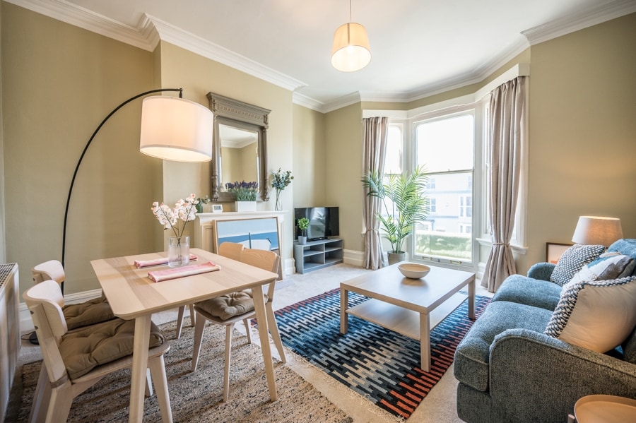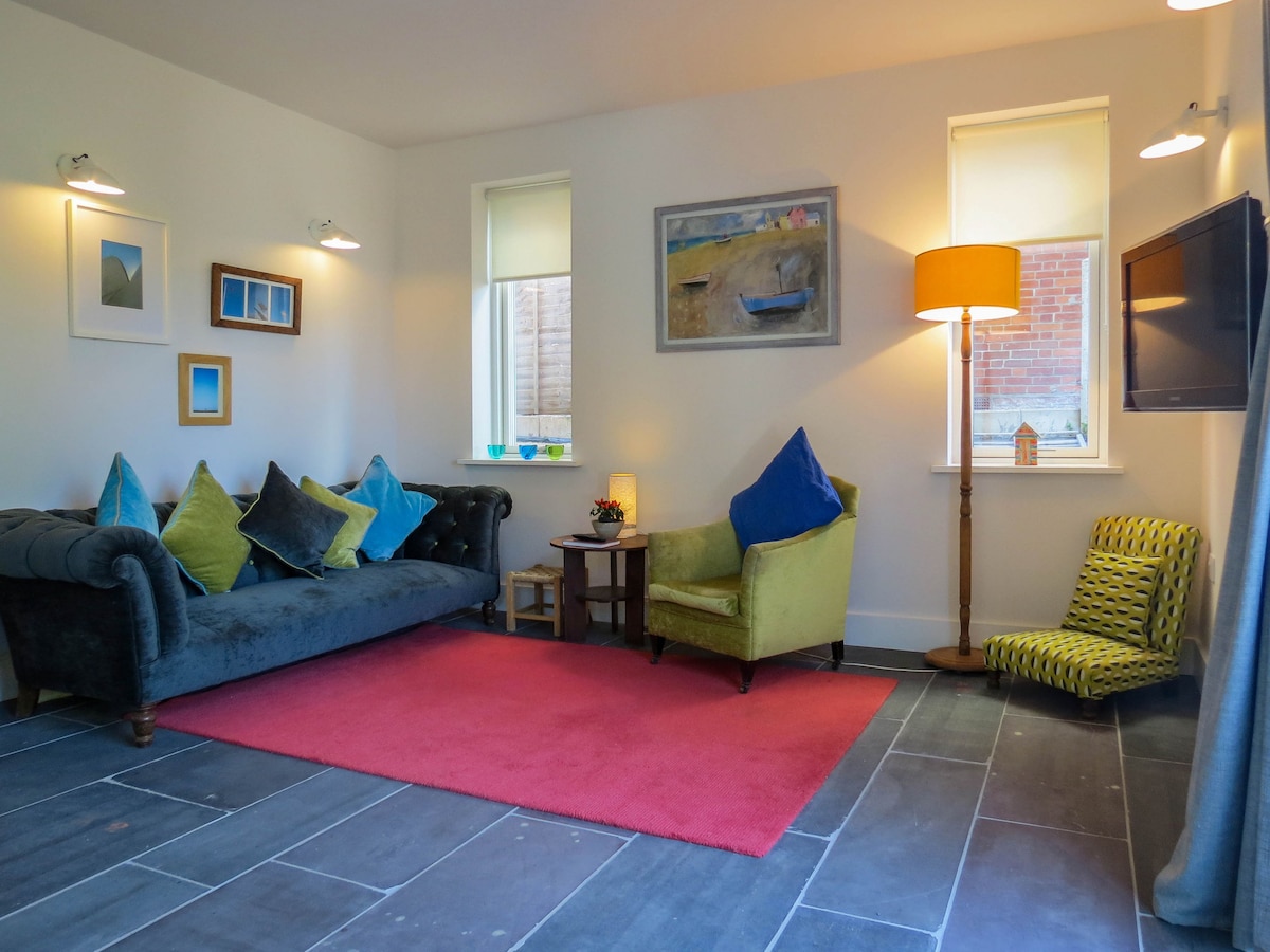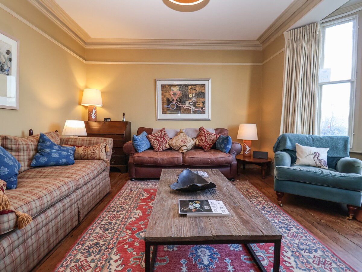 Living Area: A light and spacious living area with bay windows overlooking Aldeburgh High Street. Flatscreen TV and Wifi