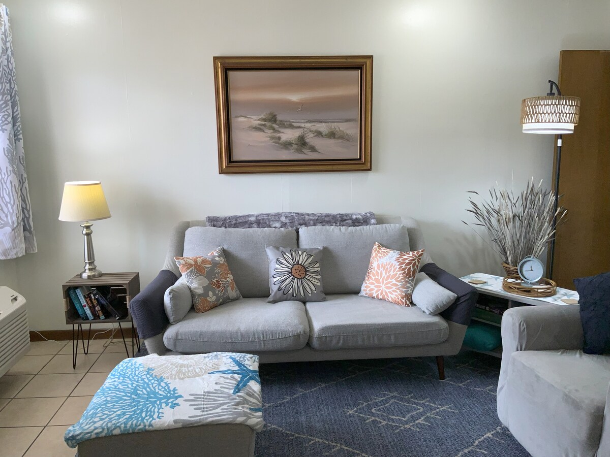 Upon entering our keyless entry unit, you'll find an open layout of the living room + kitchen. A comfy sofa & throw blanket will let you cozy up in front of the smart TV with a Hulu subscription!