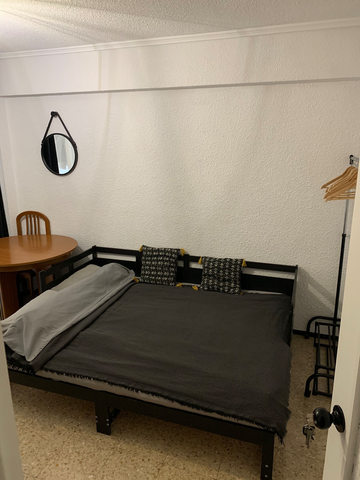 Single bed, air conditioning, closet with hangers, ironing board, desk with night lamp and mirror.