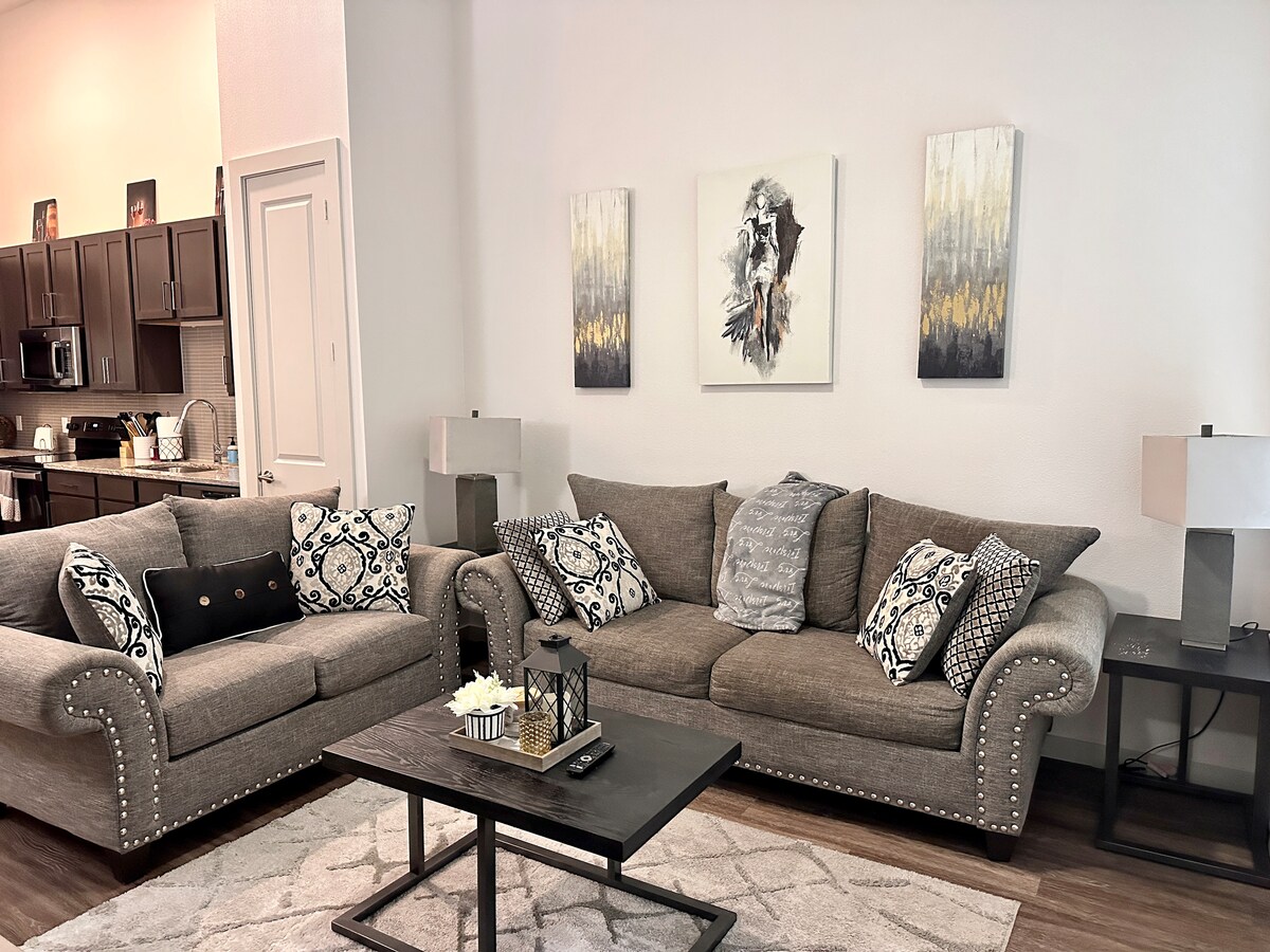 Step into this 2 bedroom 2 bathroom apartment and you will feel at home right away, carefully curated for your every need. Our two-bedroom apartment is filled with features that are meant to cater to your lifestyle from a swimming pool, cozy gym, luxurious living room, walk-in closets, full-size washer/dryers, well-fitted rooms and every amenity to make your stay comfortable is available.