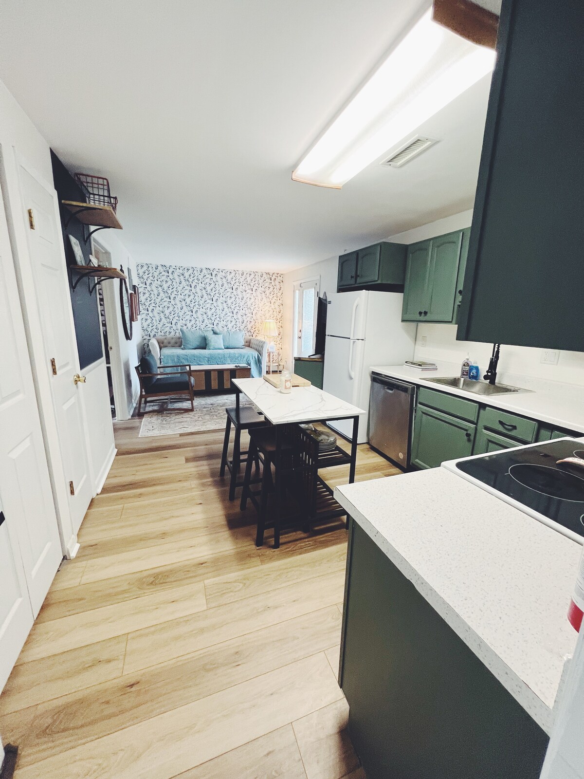 The kitchen has a full set of pots and pans, dishes, cups, silverware, and cooking utensils. We also provide a variety of spices above the stove for your use. For every stay, each guest gets the use of a brand new sponge, bath & body works hand soap, full dish soap, 1 new roll of paper towels, and 2 clean dish towels. The dining room table is a great spot to set up your laptop and work. There are different outlets right behind the table for your laptop or phone.
