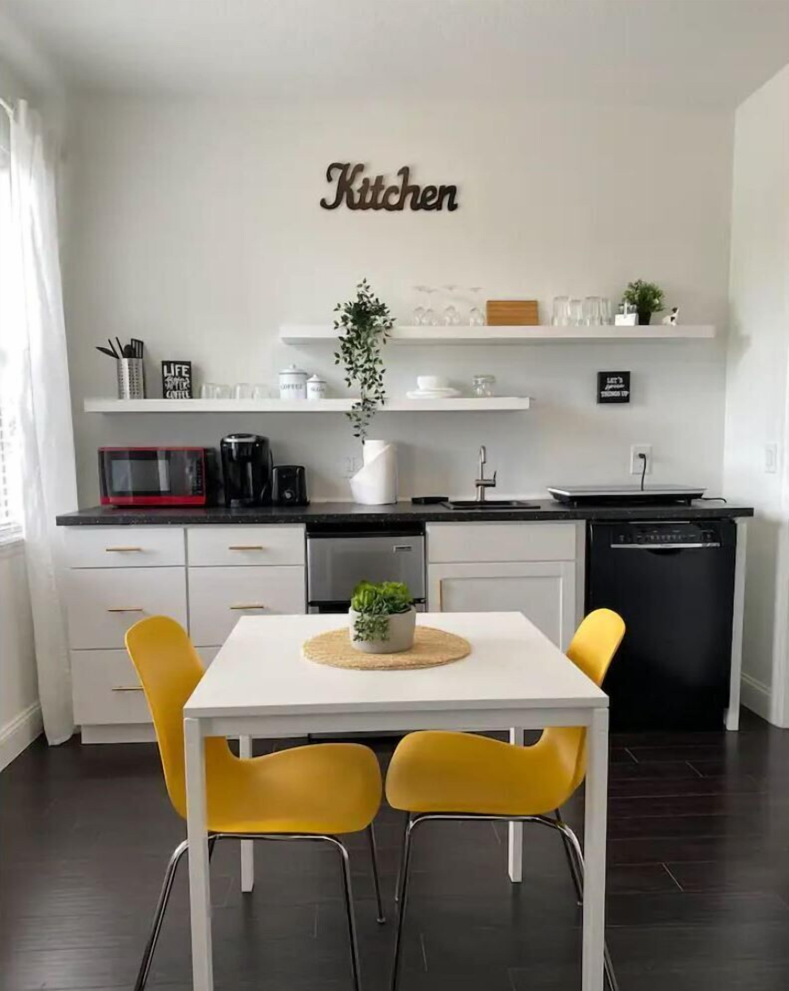 Great for business travelers or if you just want to come and relax. There are Pots and pans for cooking, blender, toaster, coffee maker and microwave. Coffee, tea, sweeteners, spring water are supplied. Plenty of outdoor spaces with Pool and lake views!