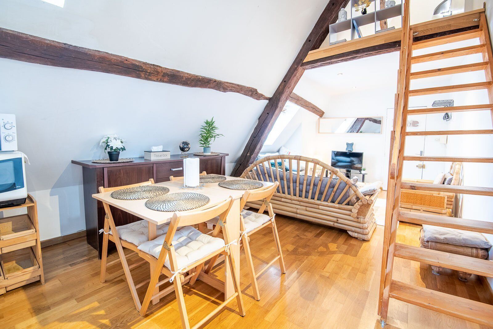 This two-room apartment, nestled under the roofs of the historic center of the city of Amboise, is very quiet.