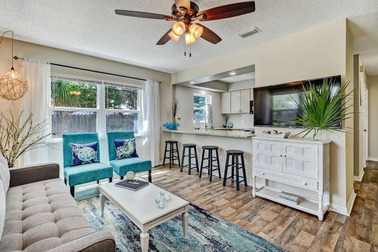 Step into a bright, open-concept living space filled with warm beachy vibes and cozy furnishings. Kick back on plush sofas, stream your favorite shows on the flat-screen TV, or simply enjoy quality time with your crew.