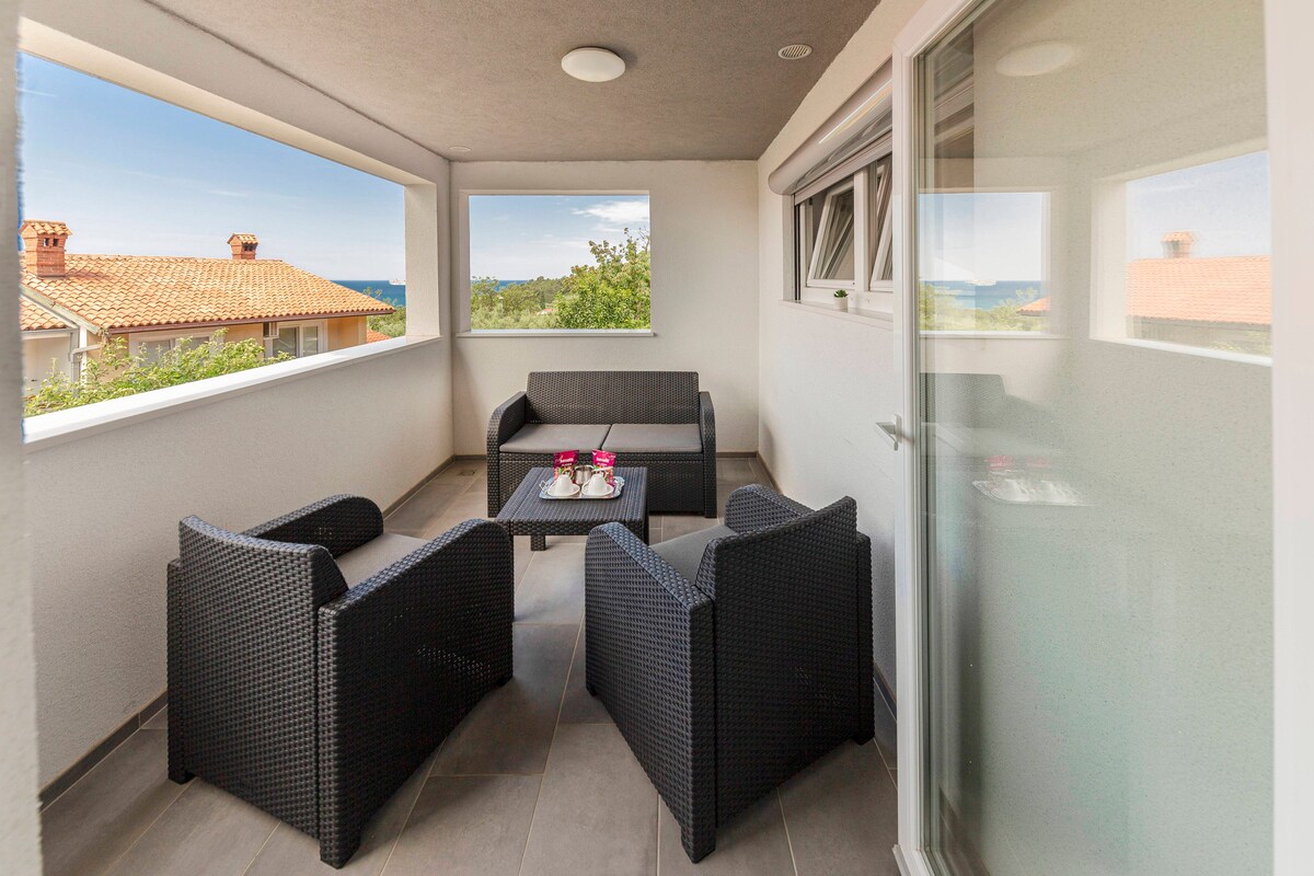 The apartment is also ideal for a romantic vacation and offers a luxurious living room with leather seating and an equipped sea-view balcony, where you can soak up beautiful panoramic views and the Istrian sun, all day long. Meanwhile, true to its modern style, the apartment features full Wi-Fi coverage, a high-quality surround system, and a fully equipped kitchen-diner for a carefree and fulfilling holiday experience.