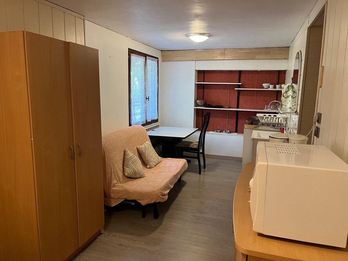 Type 1bis on the ground floor, composed of a living room, a bedroom separated from the living room by two sliding doors "workshop canopies" style and a large independent and fully equipped kitchen. Shower room with WC. The apartment is close to all shops. A CASINO supermarket is 300 meters away. Bakery, pharmacy, newspapers are in the condominium. The urban bus stops (2 different lines to Annecy center) are 250 meters away.