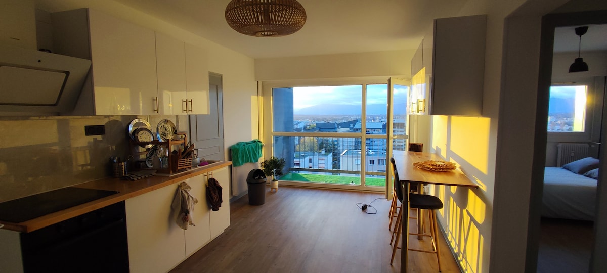 On the outskirts of Geneva, between Lake Leman and the mountains... Downtown Annemasse, shops and services nearby. Bus and tram to Geneva 300 m away, train and CEVA 500 m away. The apartment is quiet and spacious (90 m2), you will have access to all amenities: living room with TV equipment (Netflix), hifi system, terrace with two quiet garden furniture (green spaces), and of course kitchen: fridge, coffee maker, dishwasher, ceramic hobs, oven, microwave, etc. (new American kitchen). It is a very quiet place, while being in the center. I would love to introduce you to the region, in the spirit of Air B and B: Lake Geneva, good places in Geneva, surrounding mountains, etc.
