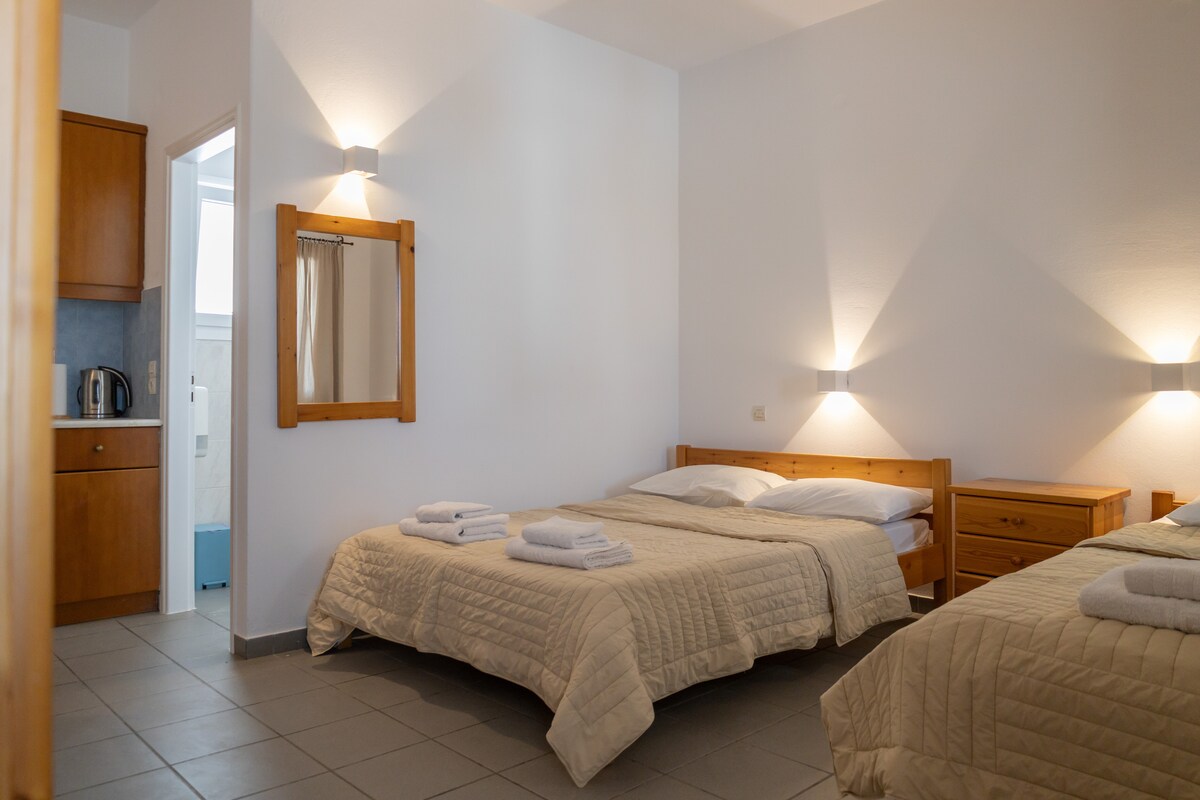 The studio consists of a spacious room with a double and a single bed. There is also a small kitchen and a bathroom with shower. There is also a covered balcony where you can stay all day.
