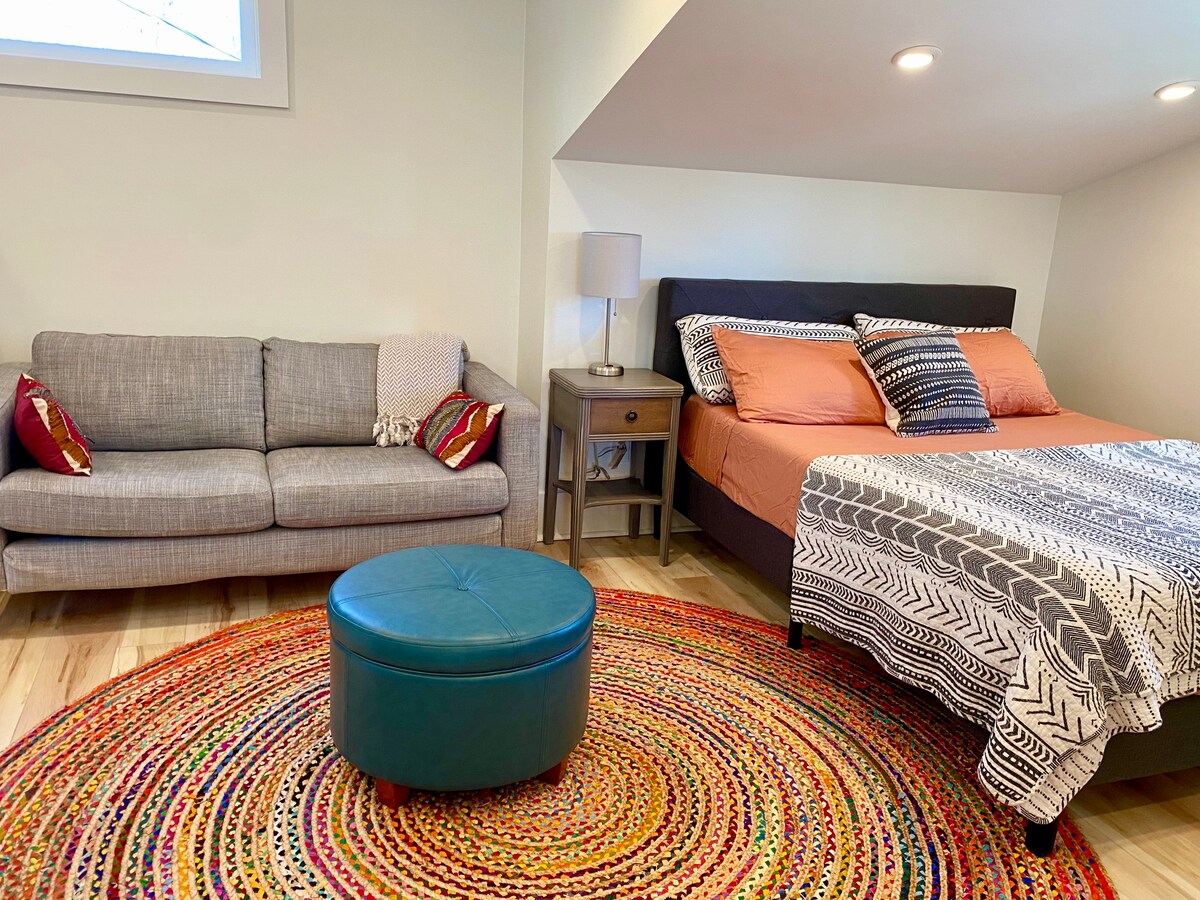 The bedroom is equipped with a comfy queen bed, iron, ironing board, extra towels/washcloths, and a hamper.