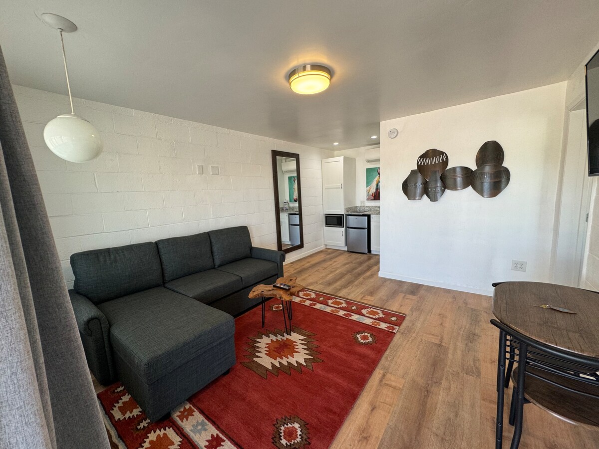 ✅ Studio - A fully furnished unit with a king-sized bed, a cozy couch, TV, work desk, ample storage, and a spacious private patio—ideal for relaxing or enjoying a morning coffee.