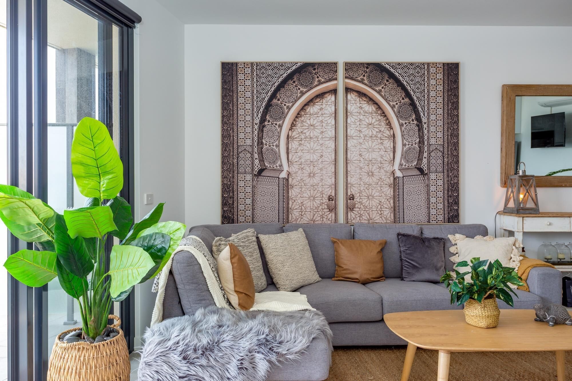 Pack your beach towels and get ready for a carefree stay at this stylish Dromana apartment! Perfect for couples or solo travelers, this vibrant retreat features a cozy queen bed with luxurious linens, 1.5 bathrooms, and a bright, open living area adorned with large pink couches and lush plants, creating a modern, inviting atmosphere.