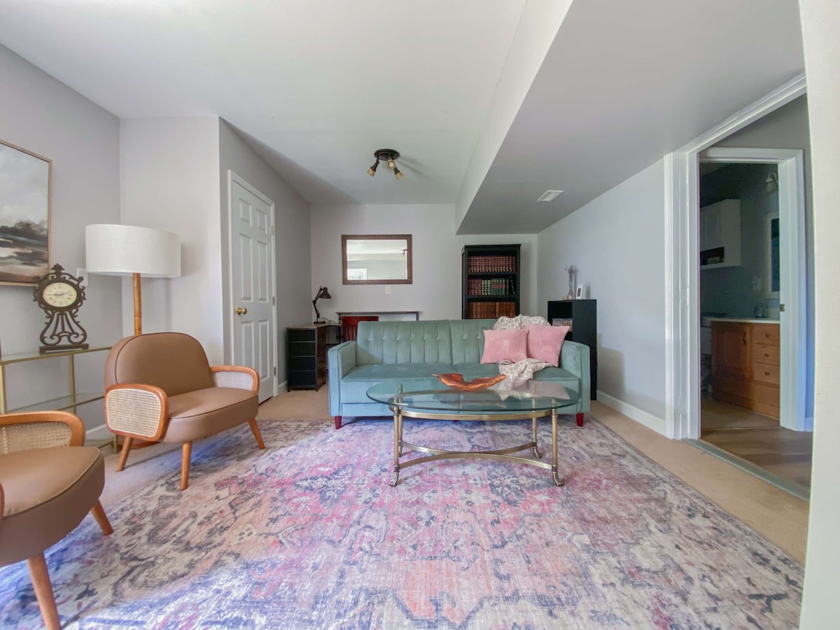 This is an apartment in the lower level of my home with 7 steps going down to your own private entrance and parking. It is very spacious and equipped with a coffee pot, 2 nuwave convection cooktops, toaster oven, hot air popper, toaster, microwave and mini fridge. Although it is not a “full kitchen” you can easily make a meal with what is available. Outside you will find a fire pit, outside seating, deck and shared front porch with beautiful views. I also will consider a dog. A $50 pet fee will be added through Airbnb. Dog must be well behaved, up to date on vaccinations and leashed while outside.