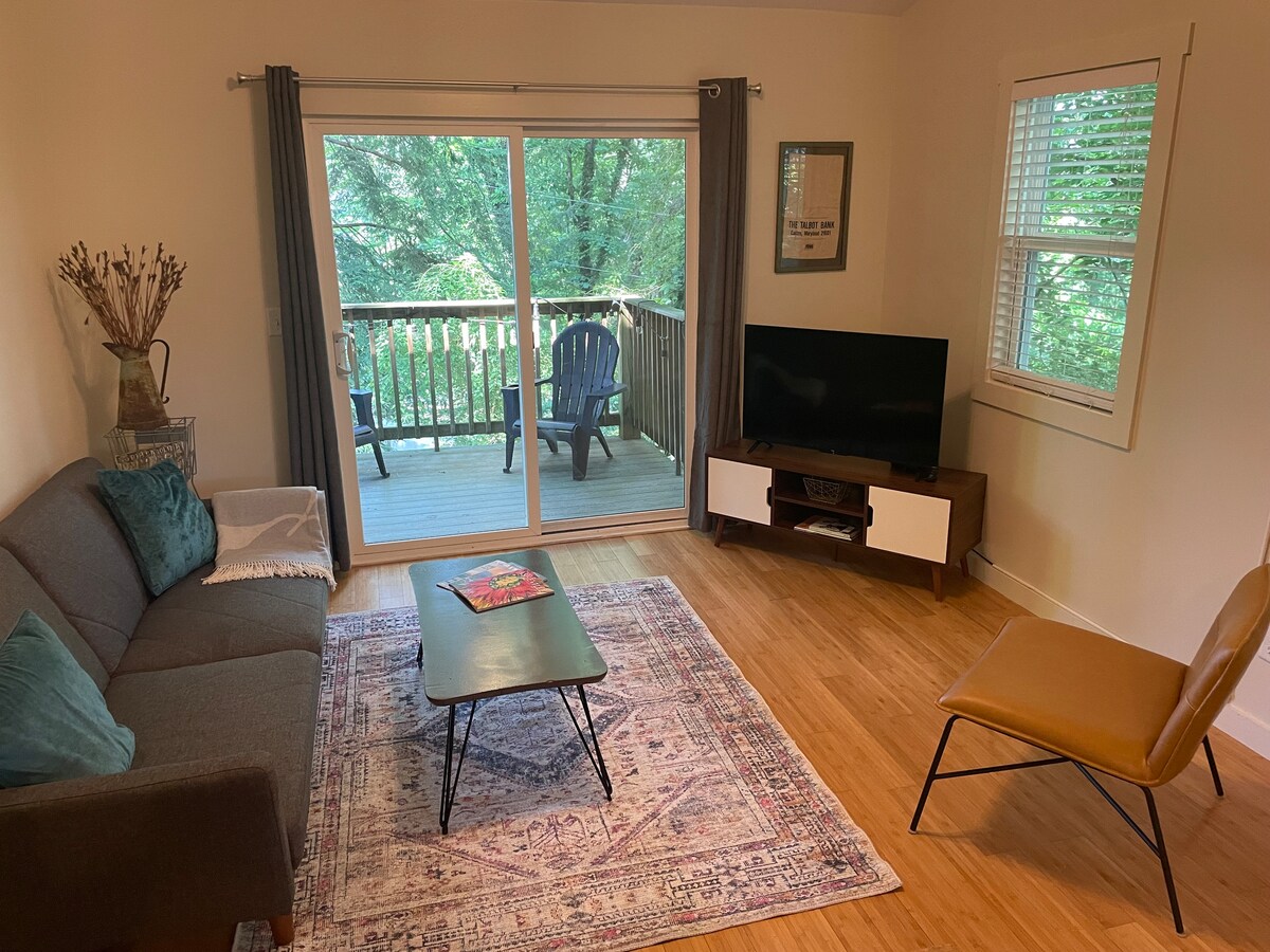 This cozy loft apartment feels as though your living in a tree house. Large elevated deck is set amongst magnificent pines & white oaks. This location is perfect for walking/biking in the neighborhood, Farmers Market or Downtown AVL. Extremely convenient to UNCA, Mission Hospital, Reems Creek Greenway, Montford Park, Nine Mile & All Day Darling. Stylishly furnished, central A/C & washer/dryer.