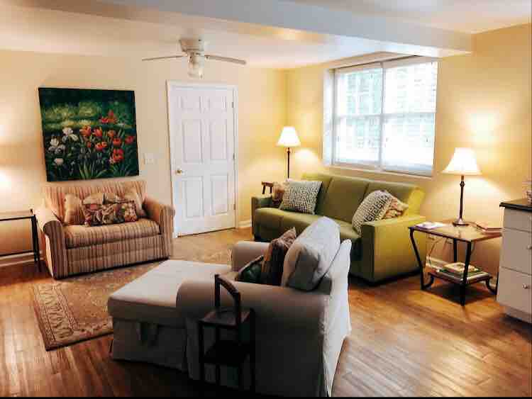Your off street parking (one space) garden entrance welcomes you with seasonal perennials and path lights at night. Patio seating for morning coffee or an evening glass of wine. Open the sliding glass doors to an apartment that includes all the home comforts including a full kitchen w/coffee and tea, a queen size bed, and bathroom tub & shower stocked with plenty of towels and personal amenities. Relax inside in the leather La-Z-boy rocker/recliner and television or play a game of bocce on the turf while grilling out on the patio.