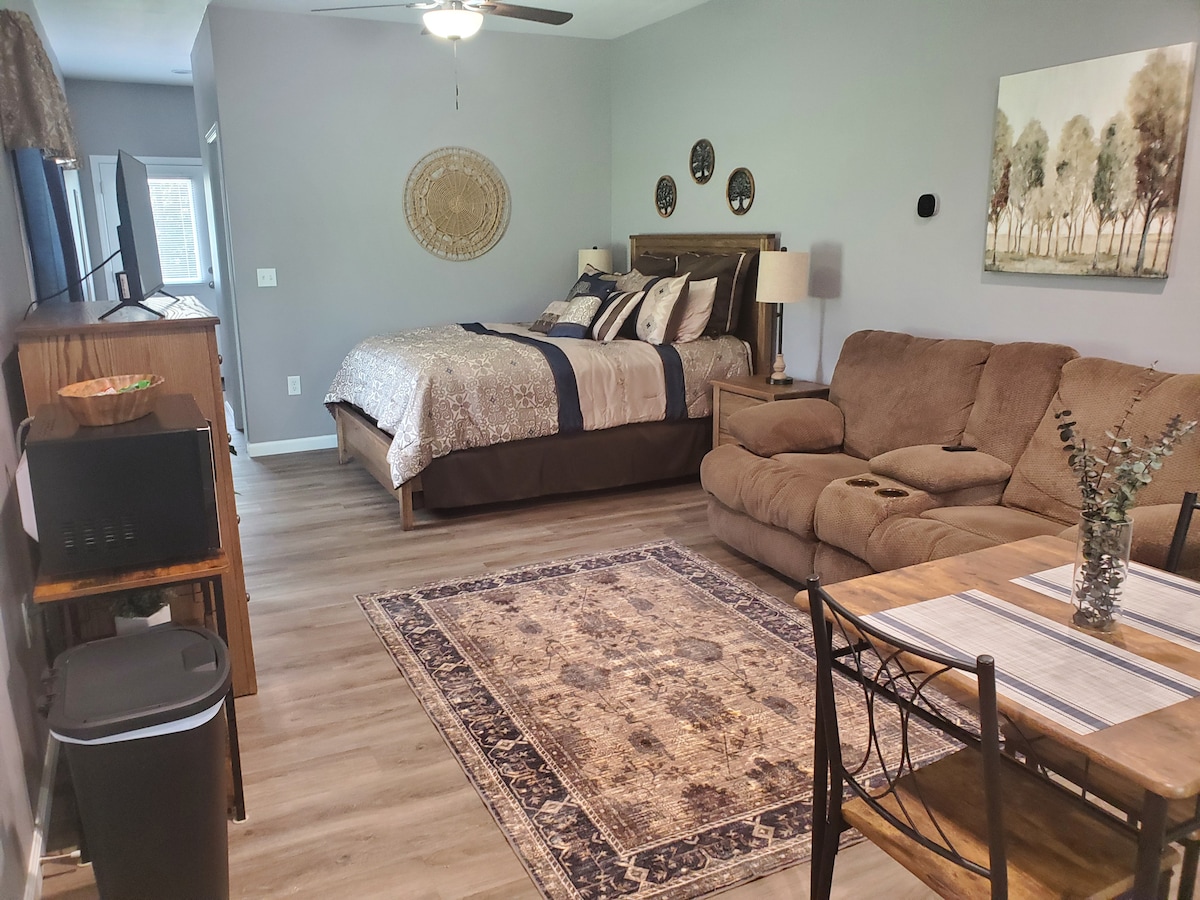 Private basement efficiency apartment with a queen bed and a futon for 2nd guest if needed. Includes and efficiency kitchen with a coffee maker, microwave, and and a small cook station for simple/quick easily prepared items. living room space, and a full bathroom as well as an outdoor sitting area that leads to the Oconee River in the back yard.
