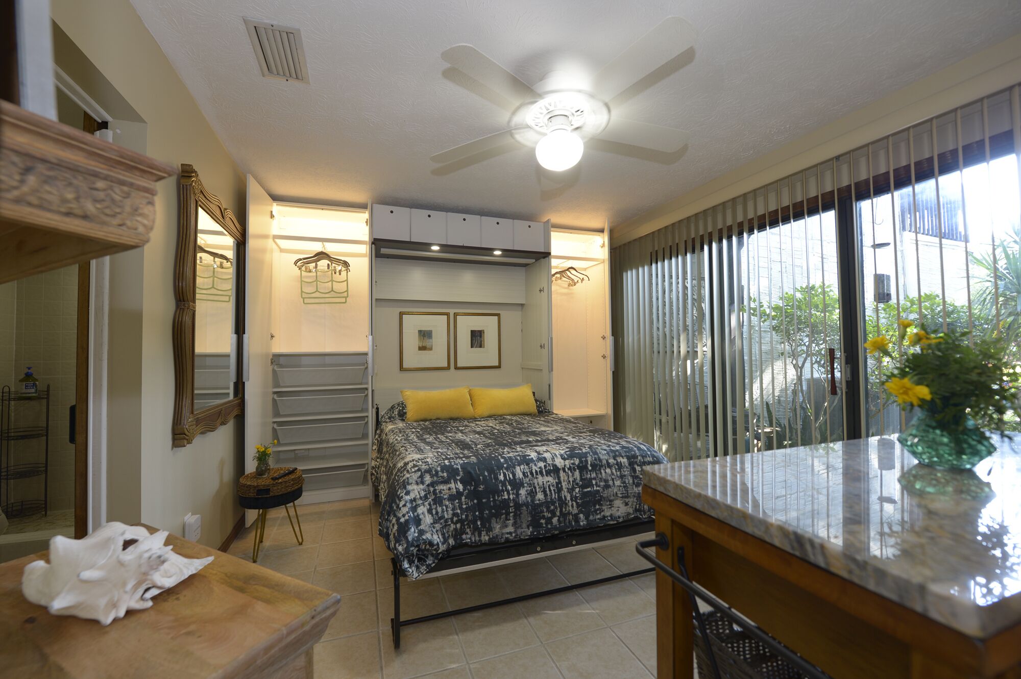 One block to the beach, this private, quiet turn-key studio apartment is perfect for your 90+ day rental needs. Kitchenette features quartzite countertop, full refrigerator, microwave with grilling features, plus all the comforts of home. Private patio looks out on a lush garden. Access to locked, garage storage, commercial washer/dryer, personal HVAC for self-determined temperature controls.