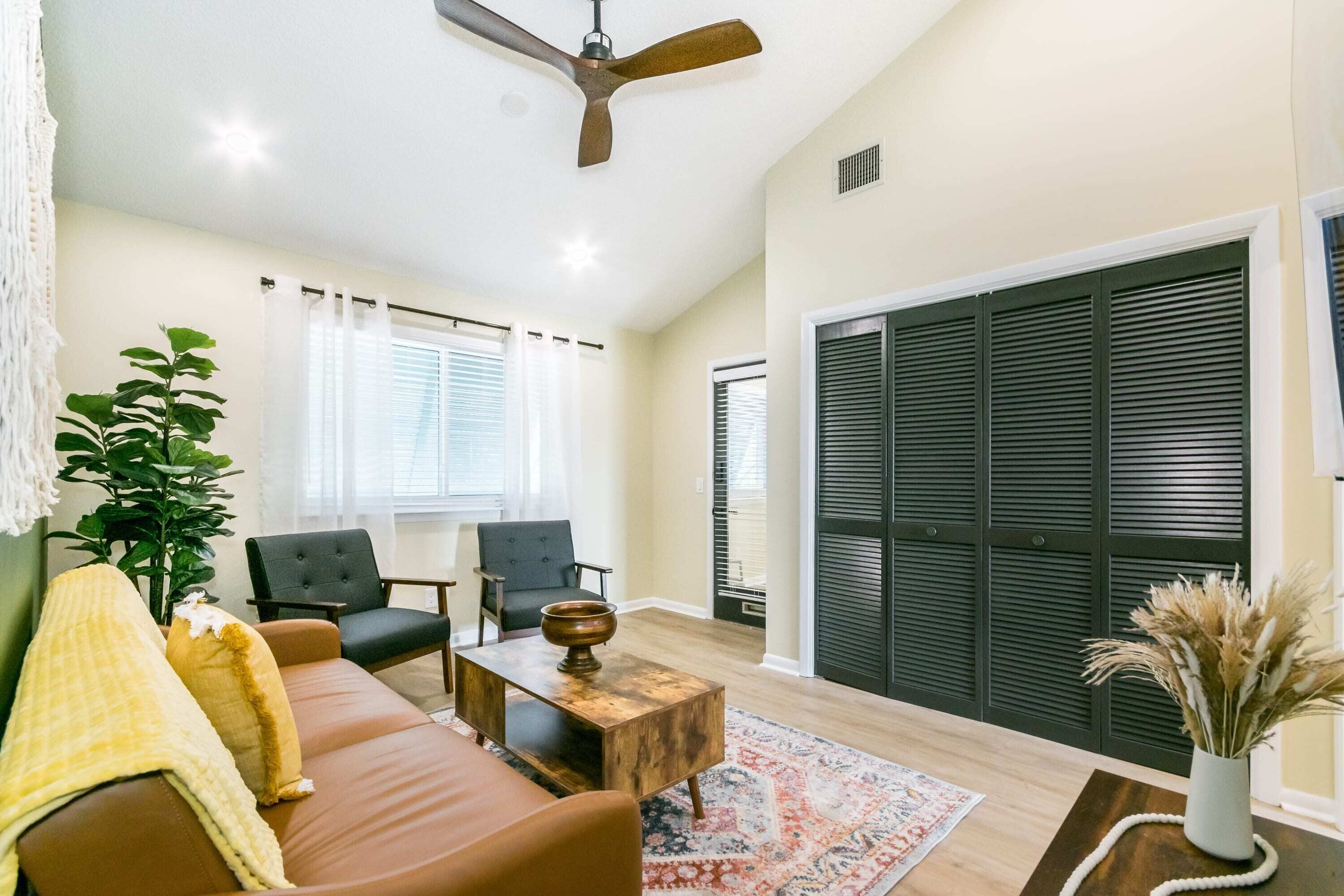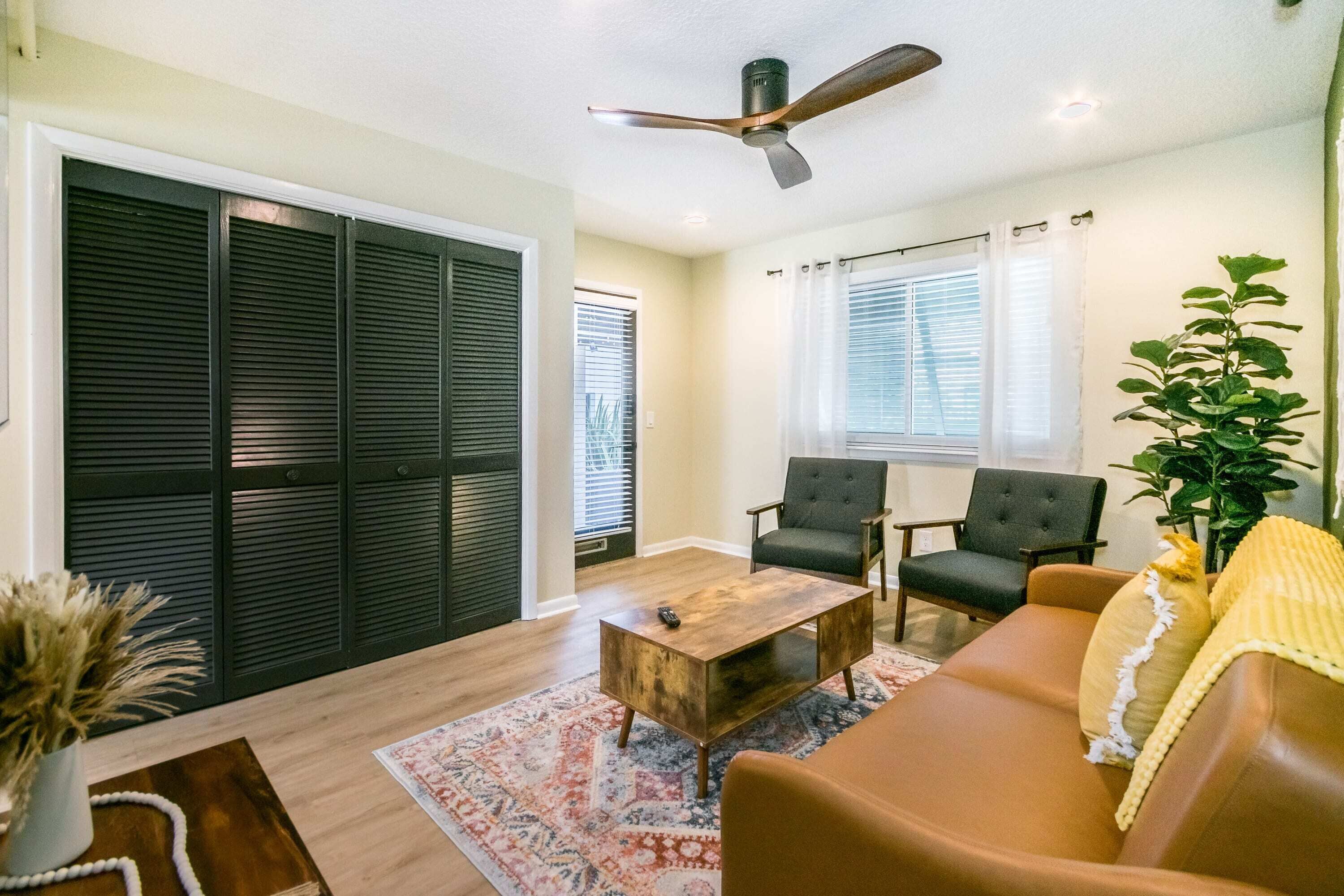 Enjoy a stylish boho-inspired experience at this centrally-located beach property. A+ location! Walk to Publix, beaches entertainment district, and beautiful sandy beaches. Near the best restaurants, bars, and boutiques the beaches have to offer. Completely renovated "like-new" with retro kitchenette, new appliances, and queen-size memory foam mattresses, washer/dryer (inside each unit!), 55' smart TV. Property sleeps 4 with queen bed in bedroom + convertible sleeper sofa in living room.