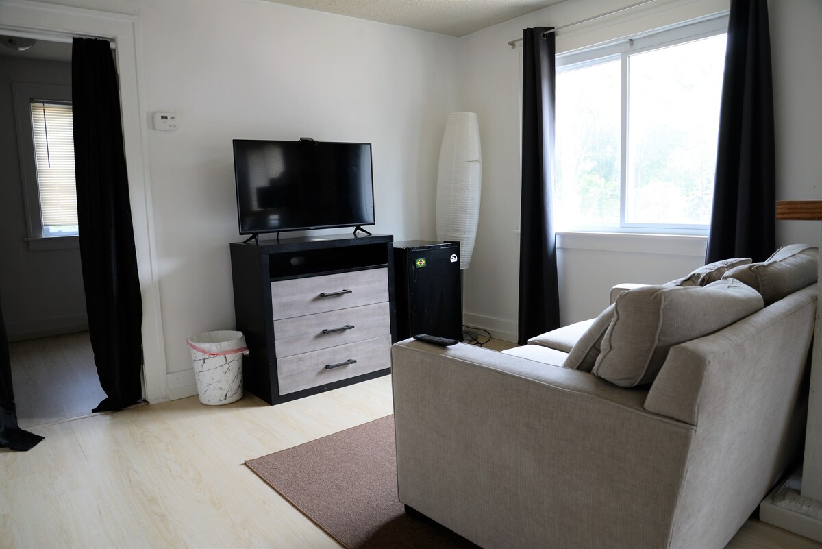 This 250 sq ft unit features a stand up shower, a new comfortable queen-size bed, Wi-Fi, TV (no cable), coffee, and a workspace. The air conditioning unit is in a window, not central AC.