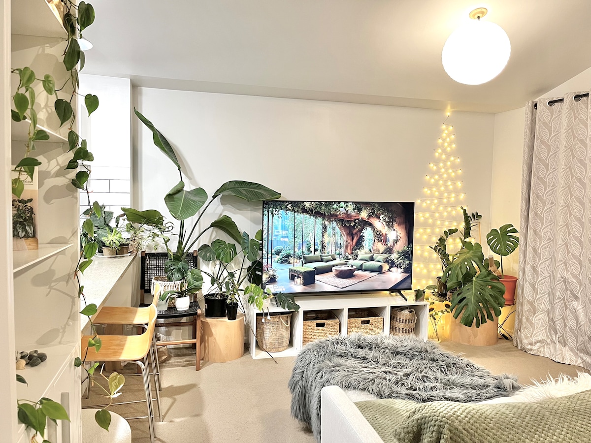 TV has a chrome cast or you can use the HDMI to plug into your laptop or device as well unlimited fibre wifi( no areial), small fridge ,toaster and microwave ,tea and coffee in room.