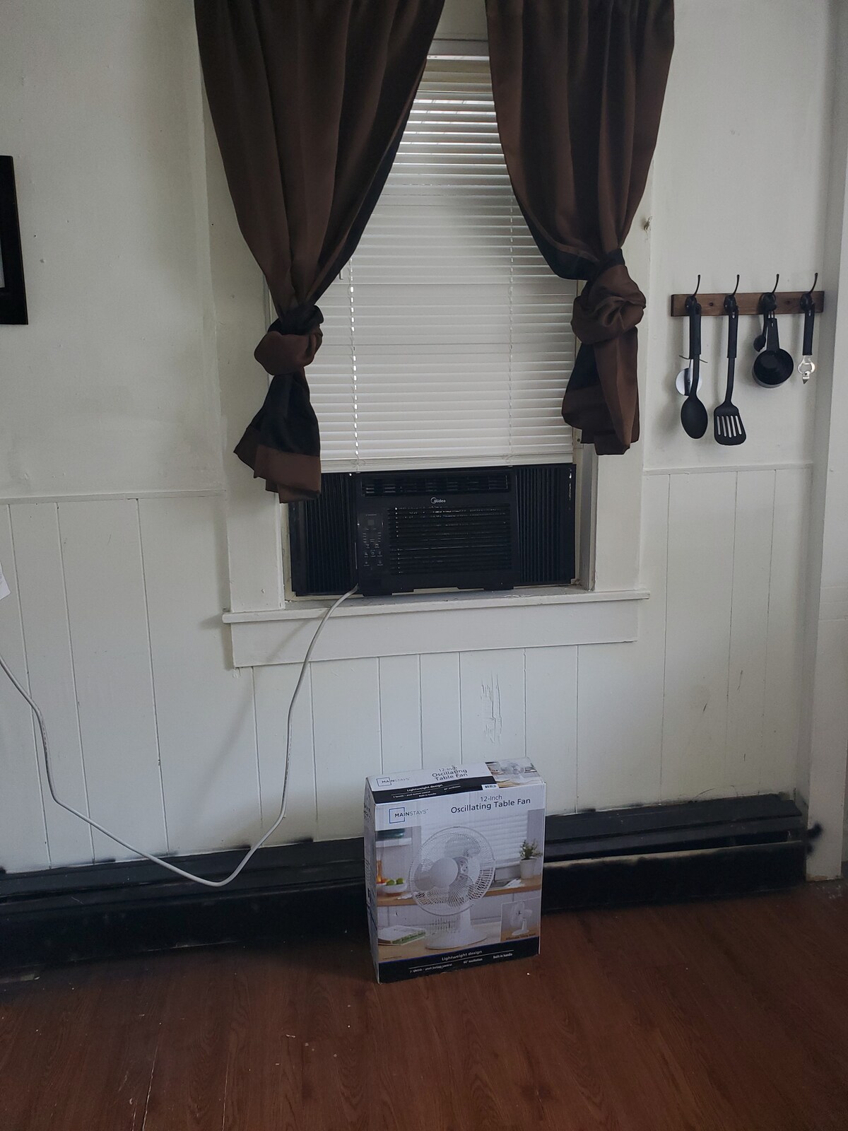 The apartment is in the back of a duplex. We are also renting out the other unit. The space is fully stocked with dishes, appliances, linens, etc. and is set up so that traveling professionals, people in between homes, or someone looking for a place to hunker down for the winter. There's a natural gas fireplace for heat, an ac/unit in the bedroom, and a box fan.