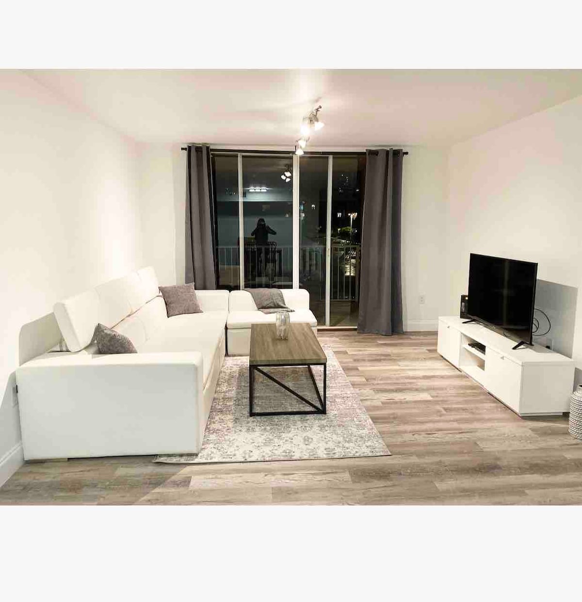 This FULLY-equipped and renovated 2 Bed Room apartment in a gated Miami-style resort complex. With modern luxurious furniture, this apartment is very close to the famous Aventura Mall and 4 minutes to SUNNY ISLES BEACH. Great location on the Turnberry Golf Course with a 3.5 mile trail for walks and runs. Equipped with 2 smart TVs with netflix, free wifi, free cable TV, all kitchen appliances and utensils, washer&dryer, 2 full beds, 1 king size bed, big spacious private balcony, and FREE parking