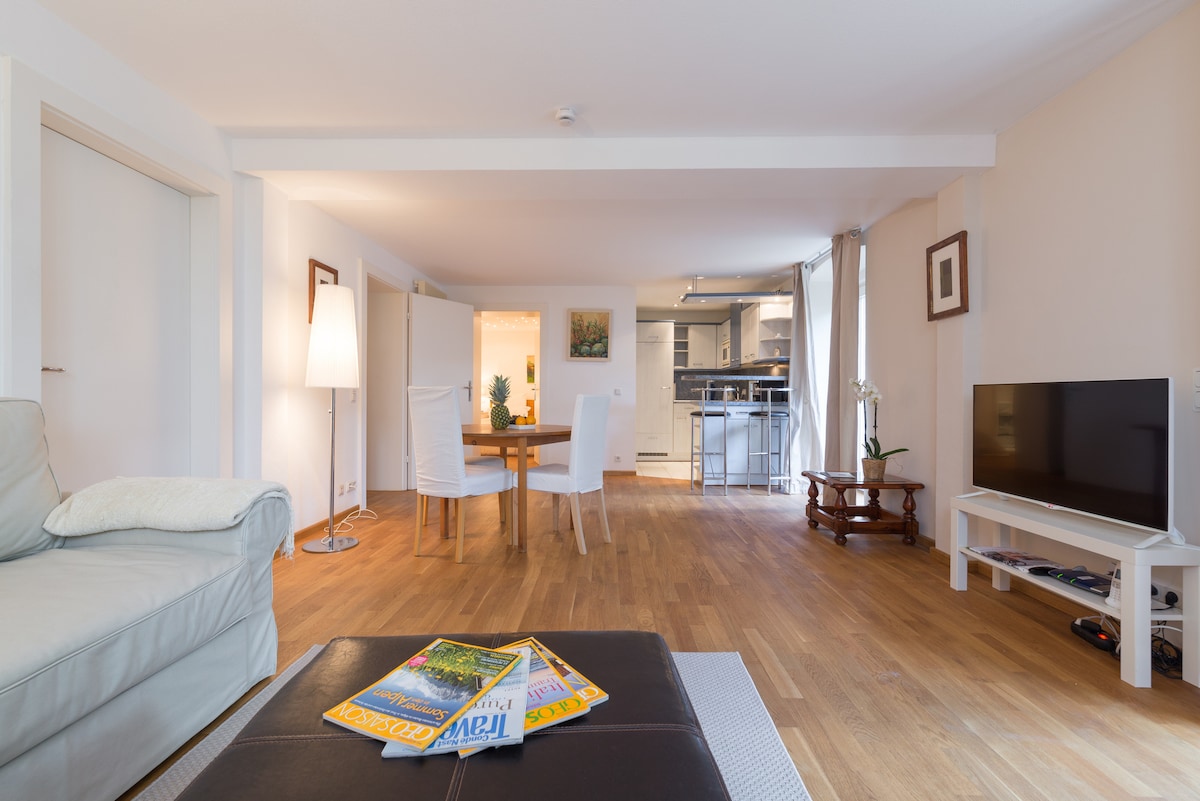 - "Stayed at Apartment 2 which had a separate Bedroom (no TV though). The living room serves as a second bedroom with two single beds and a sleeper Sofa. The living room was very bright in the morning because there are no black out curtains installed. It was very hot when in Germany during our stay, the apartment doesn't have an air condition. Bakery and some great dining options in walkable proximity."