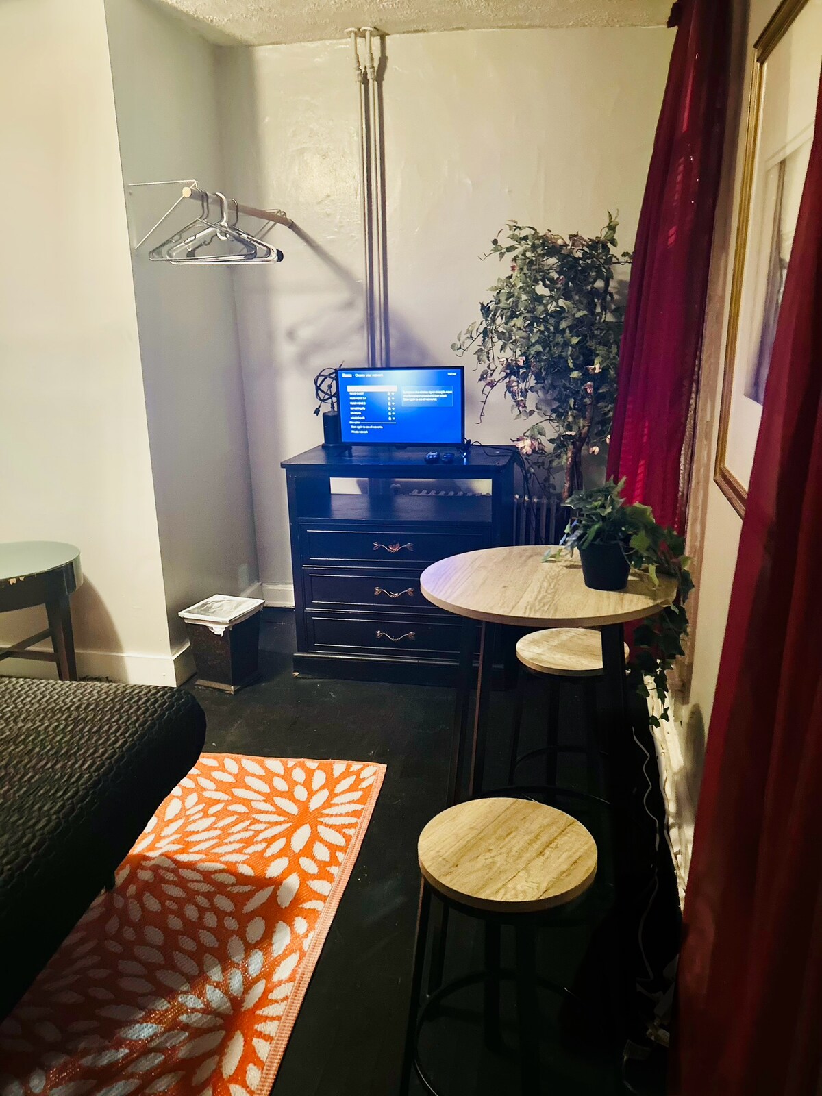 Cozy and stylish den room designed for comfort and functionality. While there are no windows, the space is thoughtfully lit and perfect for relaxation or work. Features a versatile futon that transitions from a full-size bed to a couch, a desk, hanging dresser, and your own mini refrigerator for snacks and drinks. Guests also enjoy access to a shared kitchen and bath, offering convenience and comfort. A charming retreat with all the essentials! This unique place has a style all its own.