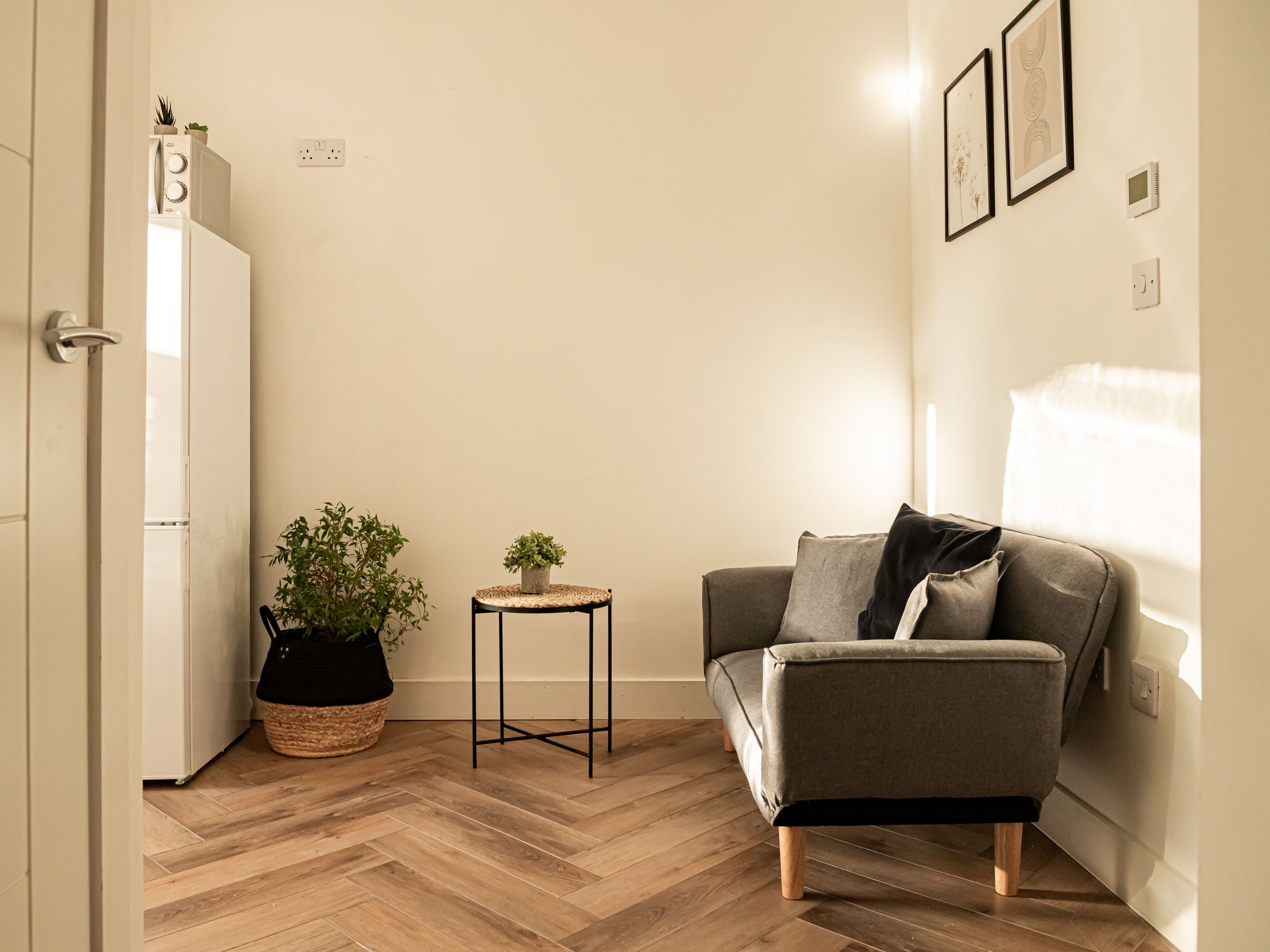 Double bed room with seating area and small kitchen with microwave, fridge and kettle. Private bathroom.