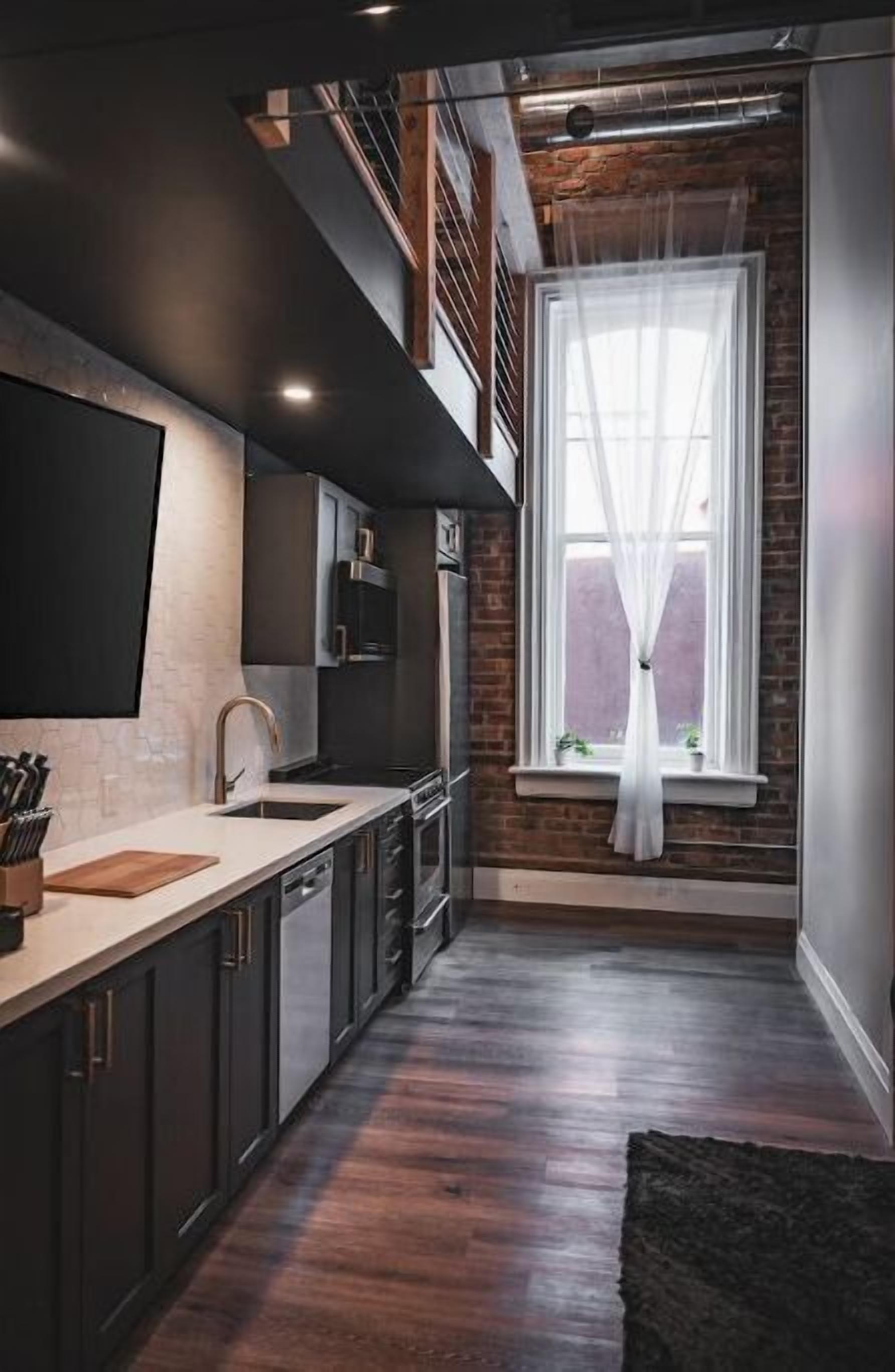 This High-end loft boasts 17 ft ceilings, character 1870 exposed brick, and a large heritage window for natural light, with compliments of modern and industrial finishes.