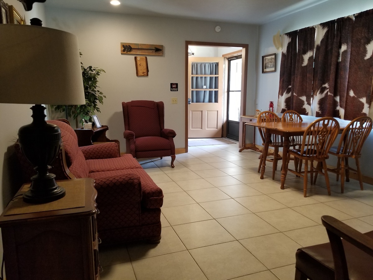 Has a separate private entrance with a key pad lock. A front living room with a dining room table, microwave, small refrigerator, coffee station, TV in front room, heating and cooling