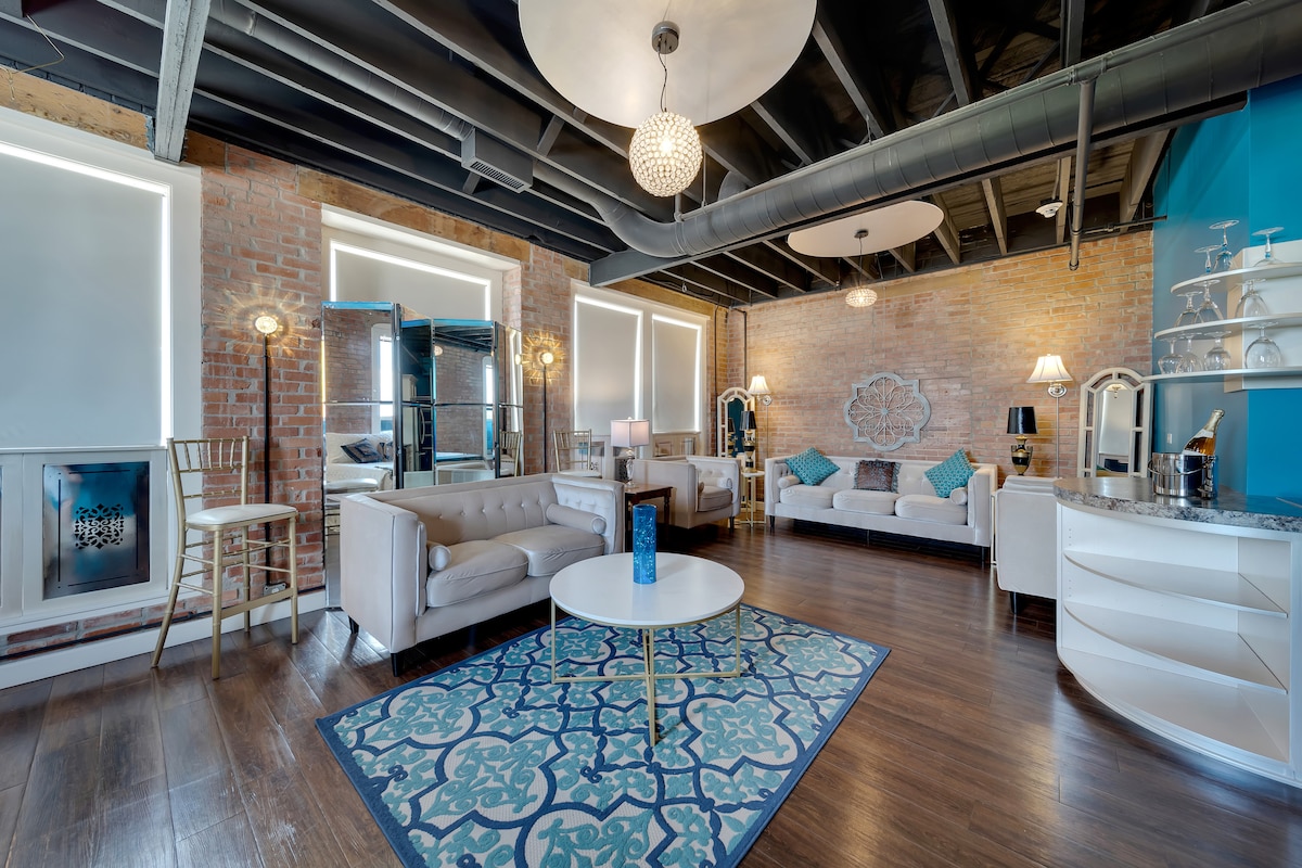 Enjoy the elegance of the vintage brick walls while staying in this vintage deco home with original corridors and stairways. Stunningly including the original 1900’s Coca-Cola mural original to the buildings history. This Beautifully decorated loft features large casement windows, new caramel warm shade furniture with depths of black tonality furniture and accents. The decor is a stunningly unique mix of current and historical styles.