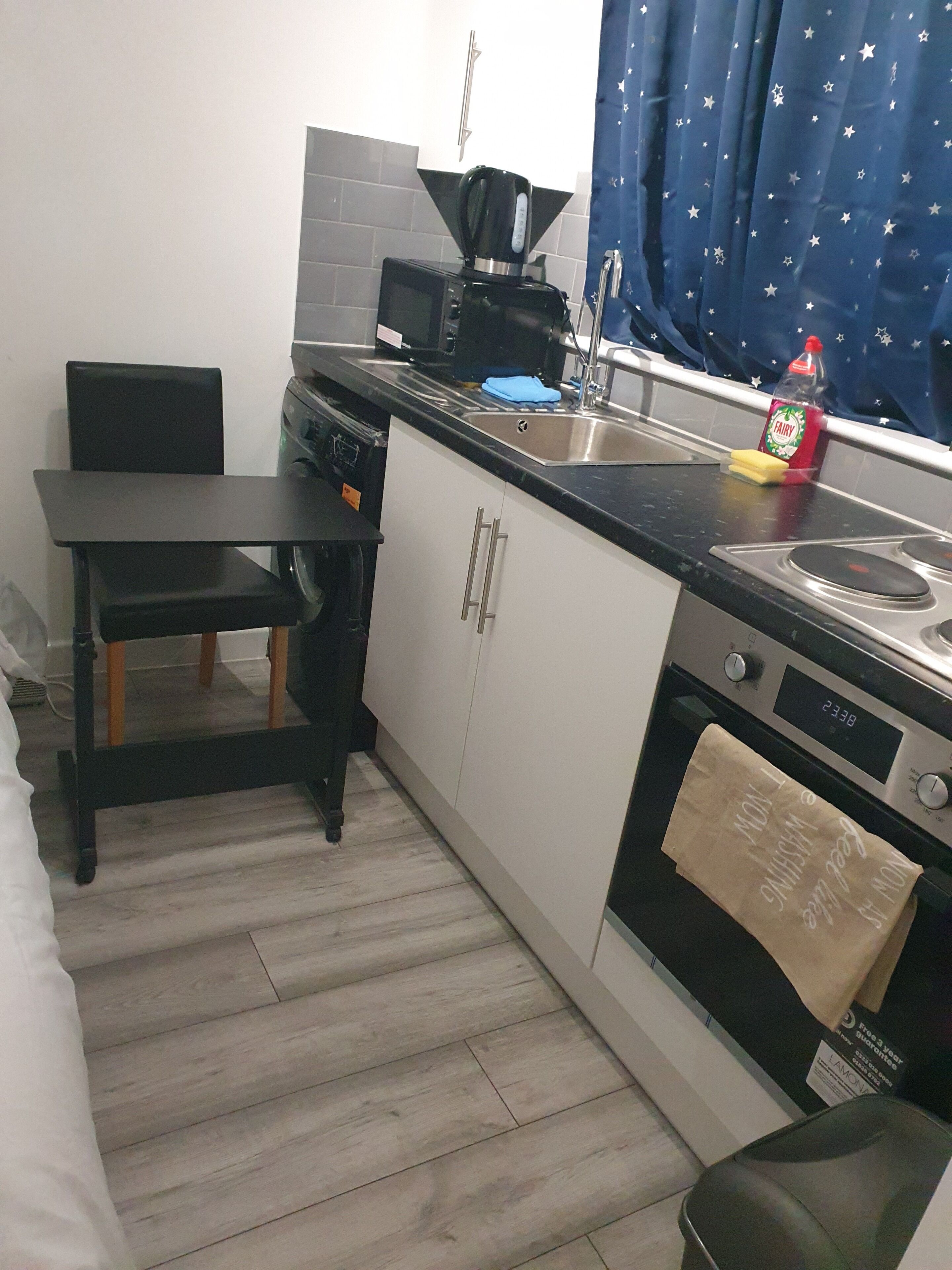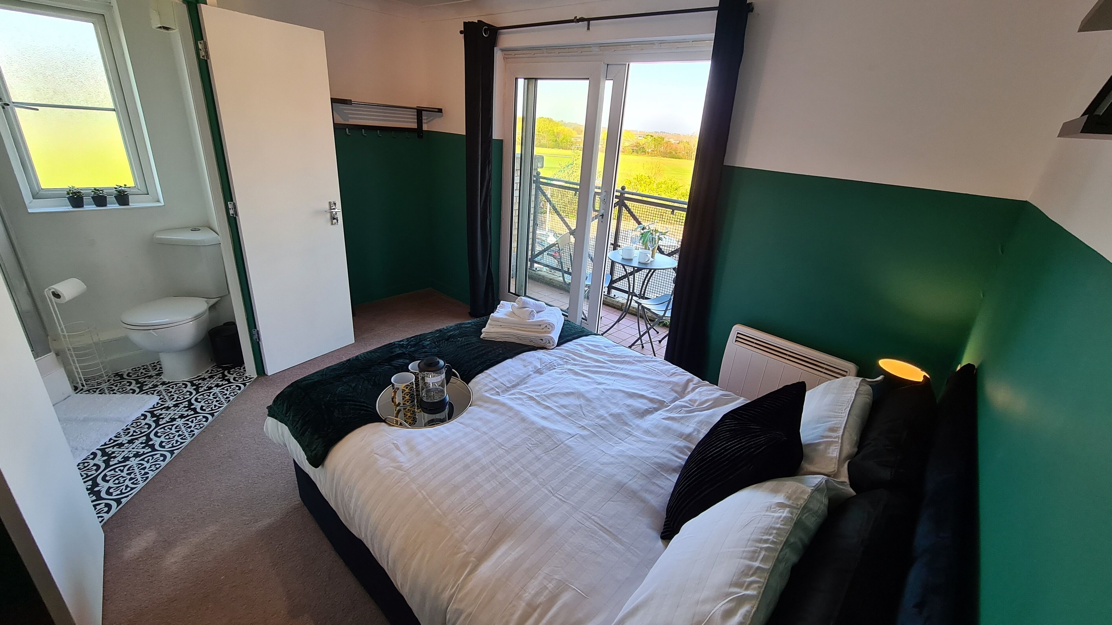 The 2 double bedrooms each come with super comfortable high quality mattresses, and a comfortable headboard for you to relax on. All of your bedding and linen is provided, so you can arrive and relax as soon as you're ready. Additionally, the bedrooms each come with their own hanging rails with additional shelf, plus a dressing area with a large mirror, dressing table for you to get ready at, and a foldable chair for you to use as you need to. The curtains are blackout, so you'll have a restful night sleep.
