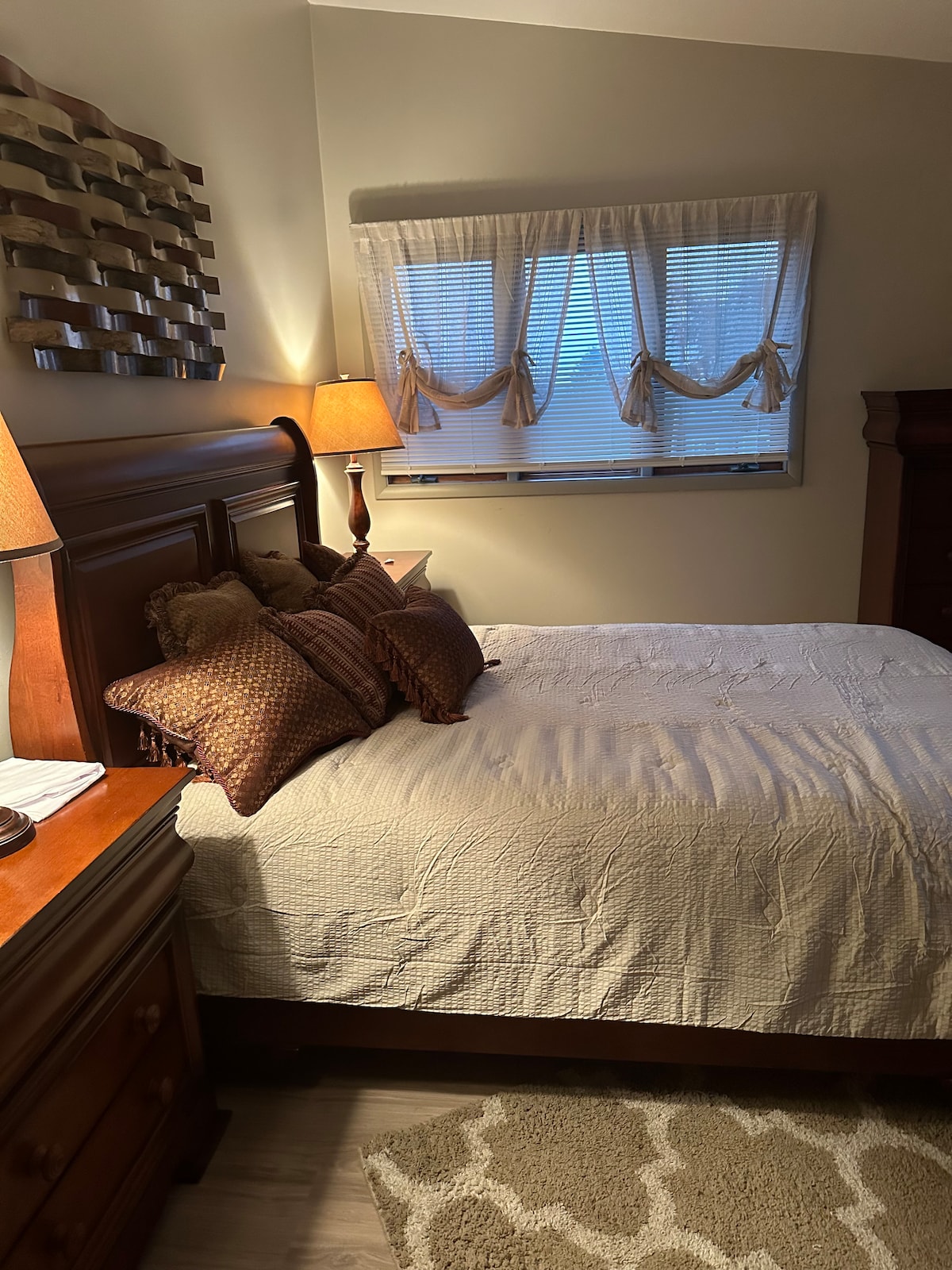Queen size bed with a closet, dresser and work desk. Fully stocked kitchen with a cozy dinning table. Living room with a roku tv and wifi.