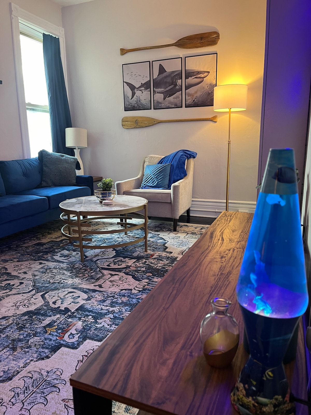 This uniquely themed two-bedroom second-floor apartment offers playfully fun accommodations in the historic district of Bay City. Our guests enjoy a tastefully decorated shark-themed unit. We offer a fully furnished space with wifi, a fully-stocked coffee/tea/cocoa bar, keyless access, and free street parking adjacent to the building. The building is just blocks from Veterans Park, Liberty Events Center, and the water, along with plenty of restaurants/bars/shopping.