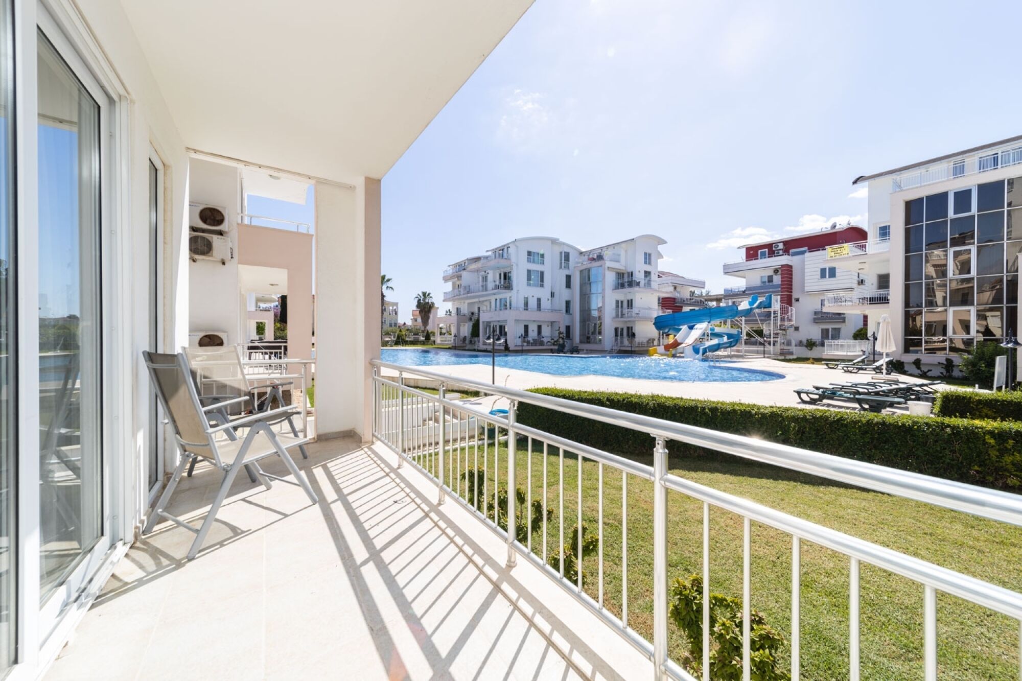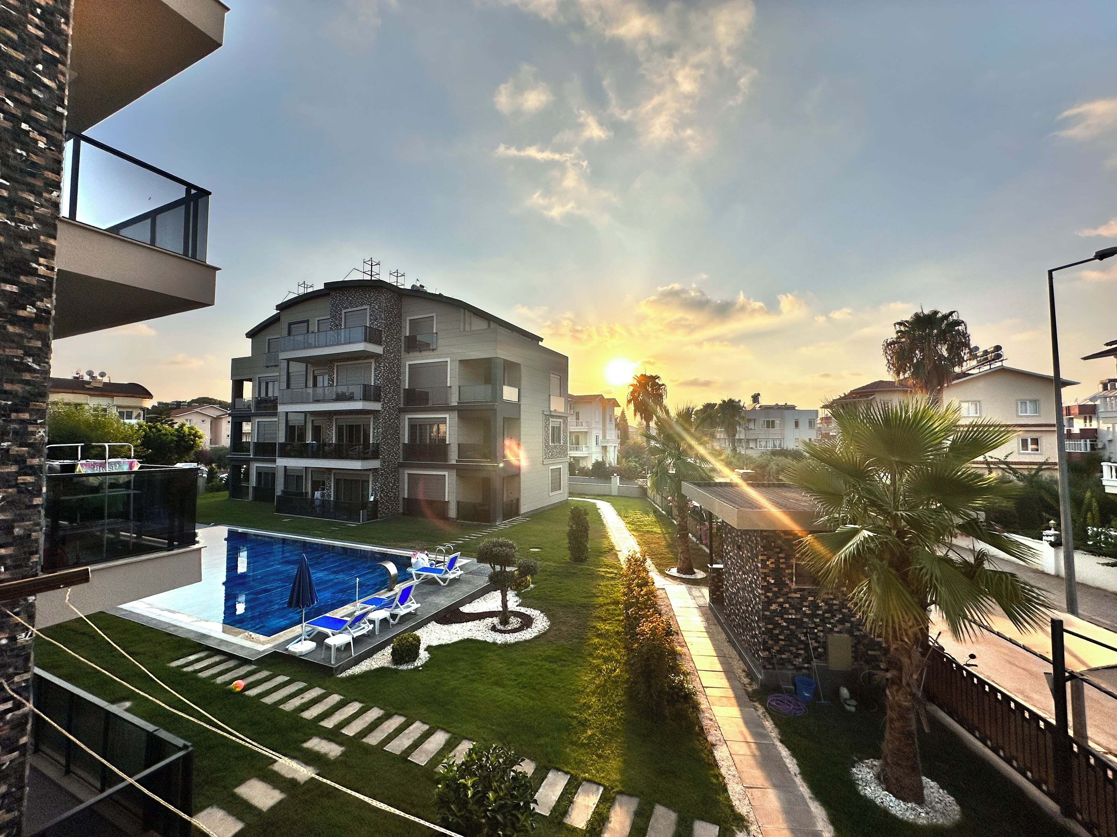 The complex 6 blocks and biggest swimming pool with water slide in belek area , around the pool sunbeds - sunbeds cushions - sun umbrellas - barbecue area - free wifi , the pool open from 08:30 till 22:00, behind the complex there is a children playground .