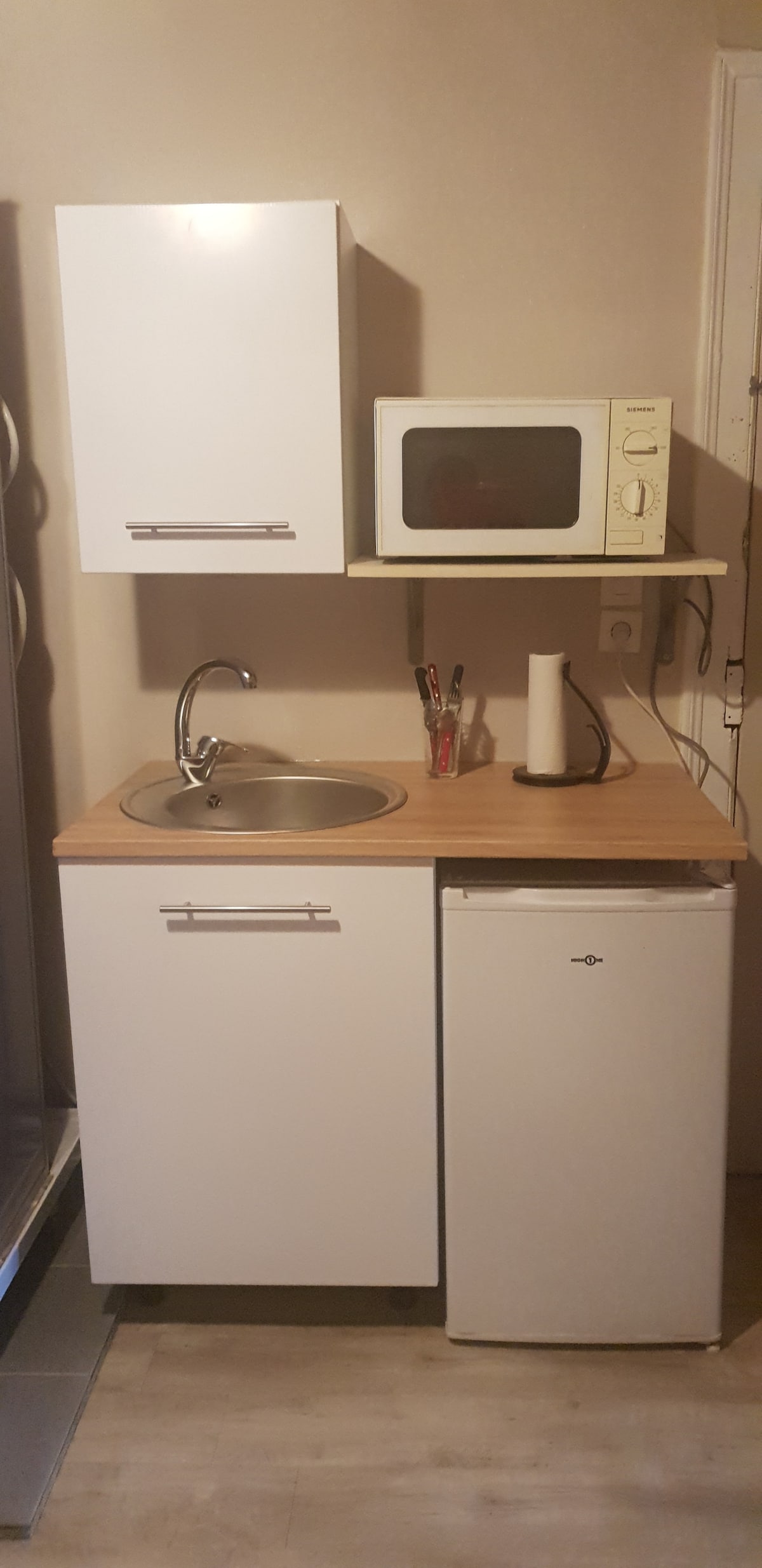 and a kitchenette ( sink, combined microwave)