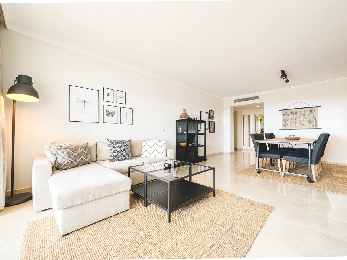 Family and Golfers paradise! This beautiful 3 bedroom apartment features panoramic sea views from it's large south facing terrace, stylish and comfortable furnishings throughout, A/C in all rooms, underground parking, large communal swimming pool, and is located less than 2 minutes from the Los Arqueros Golf Course. Situated in the Los Olivos community, the property enjoys a relaxed and calm environment, while being conveniently close to the excitement of Puerto Banús, the beach and amenities!