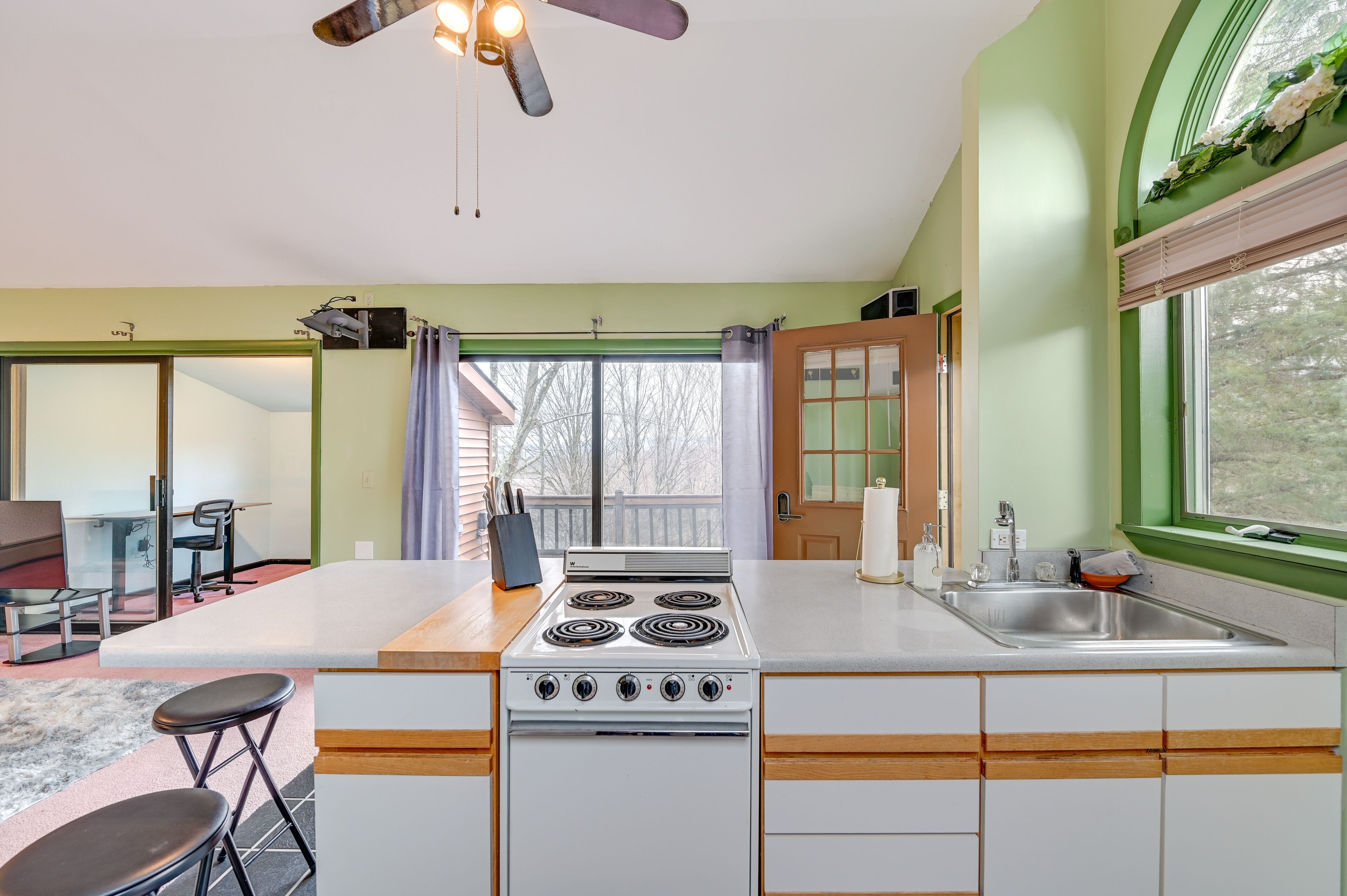 The living room has a large window with a view of the Green Mountains. The Smart Roku TV is 55” and ready for use with your Netflix and Hulu streaming service accounts.
