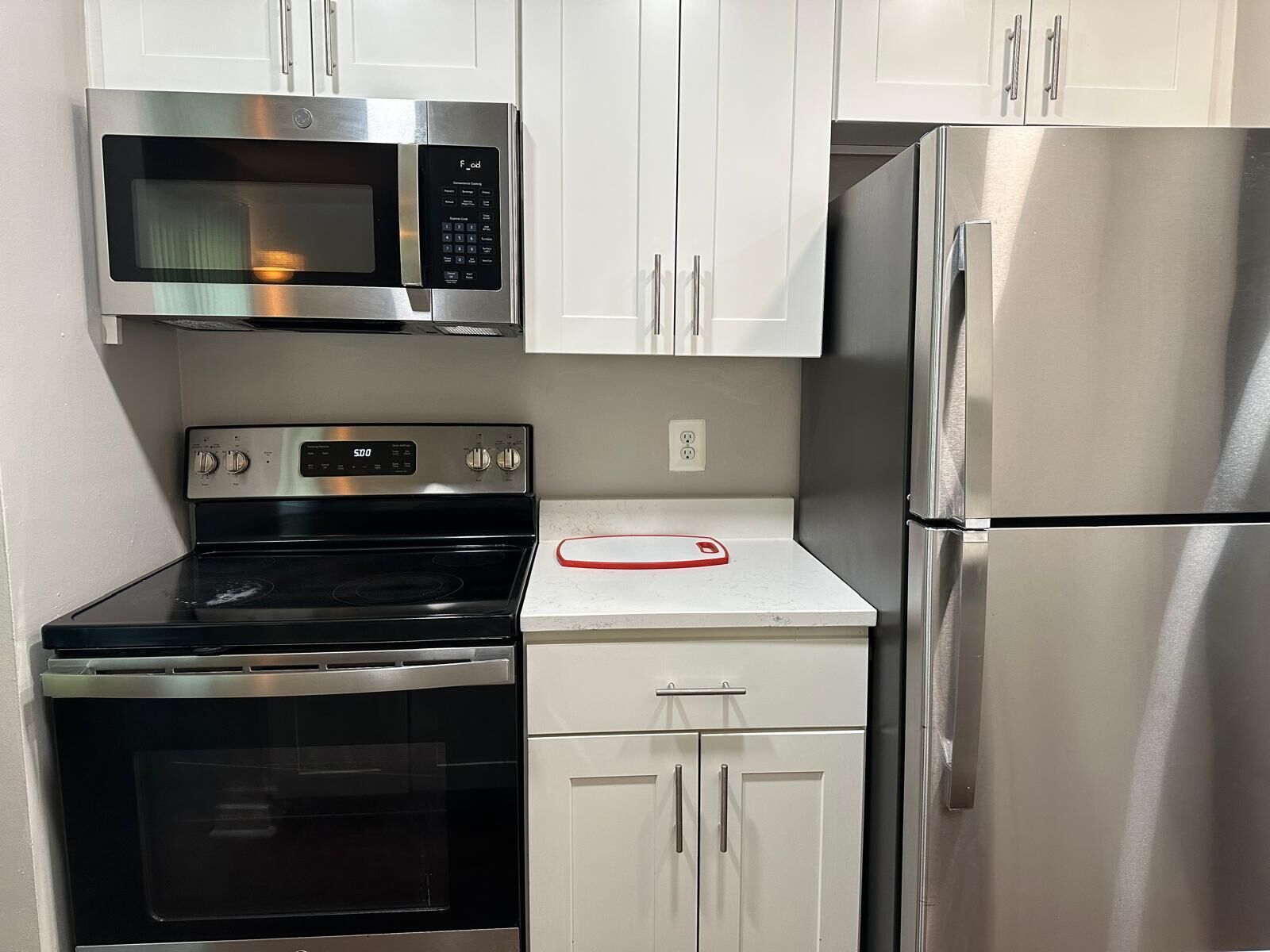 In the kitchenette area, there is an induction stove top, electric kettle, coffee maker, large microwave and full size refrigerator.