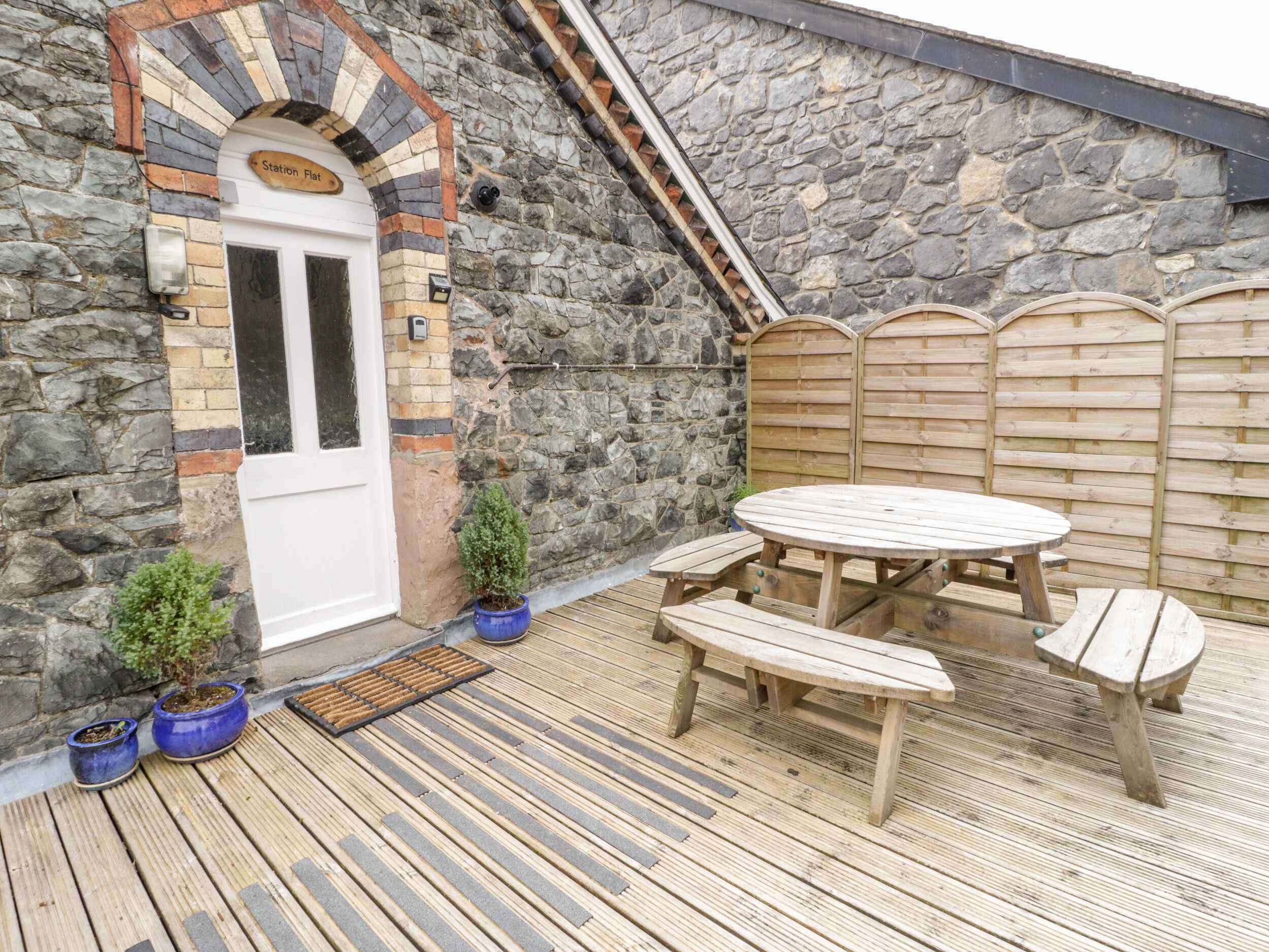 Station Flat is a first floor apartment in the centre of Betws-y-Coed. The apartment is accessed up a private, external spiral staircase and sleeps eight people in four bedrooms - two doubles and two twins. There is a bathroom with bath, separate shower, basin and WC. The living accommodation comprises a fitted kitchen and sitting room with electric fire and dining area. There is also a TV room. The apartment benefits from a large balcony with decking and furniture. With the apartment being located above a cafe/takeaway in a parade of shops, the village amenities are literally on the doorstep. With wonderful walking and outdoor activities to enjoy too, Station Flat makes a great base for a Betws-y-Coed holiday.