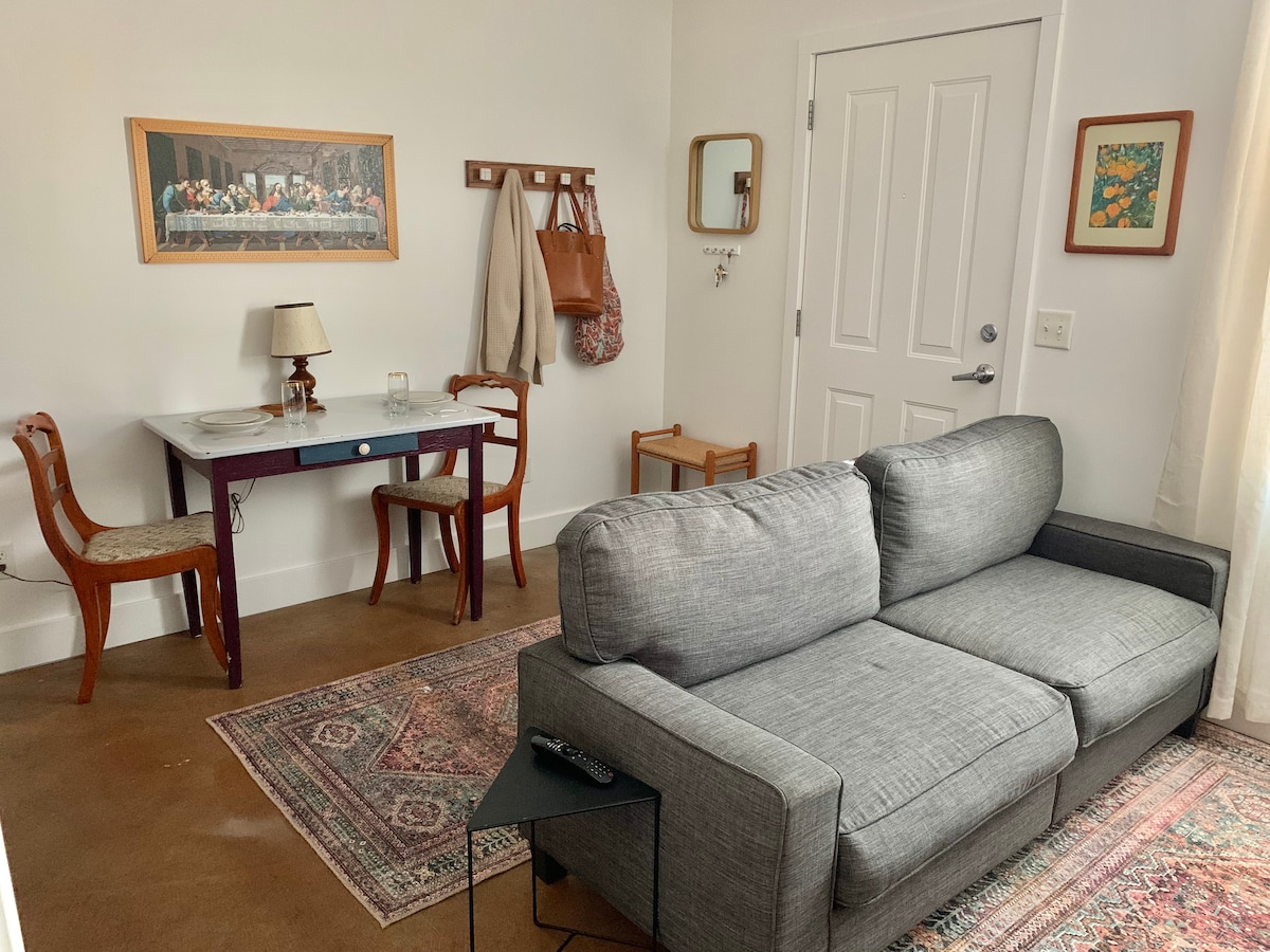 This space is recently renovated, centrally located, and stylishly cozy. It has a queen bed and a futon that can sleep one adult or two small children.