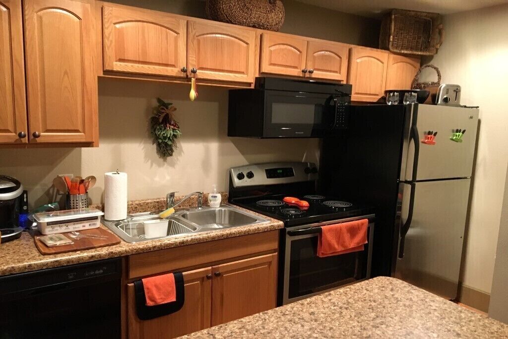 Much like an extended stay hotel at a fraction of the cost! Everything you need to cook and serve a meal with dining area for 4.