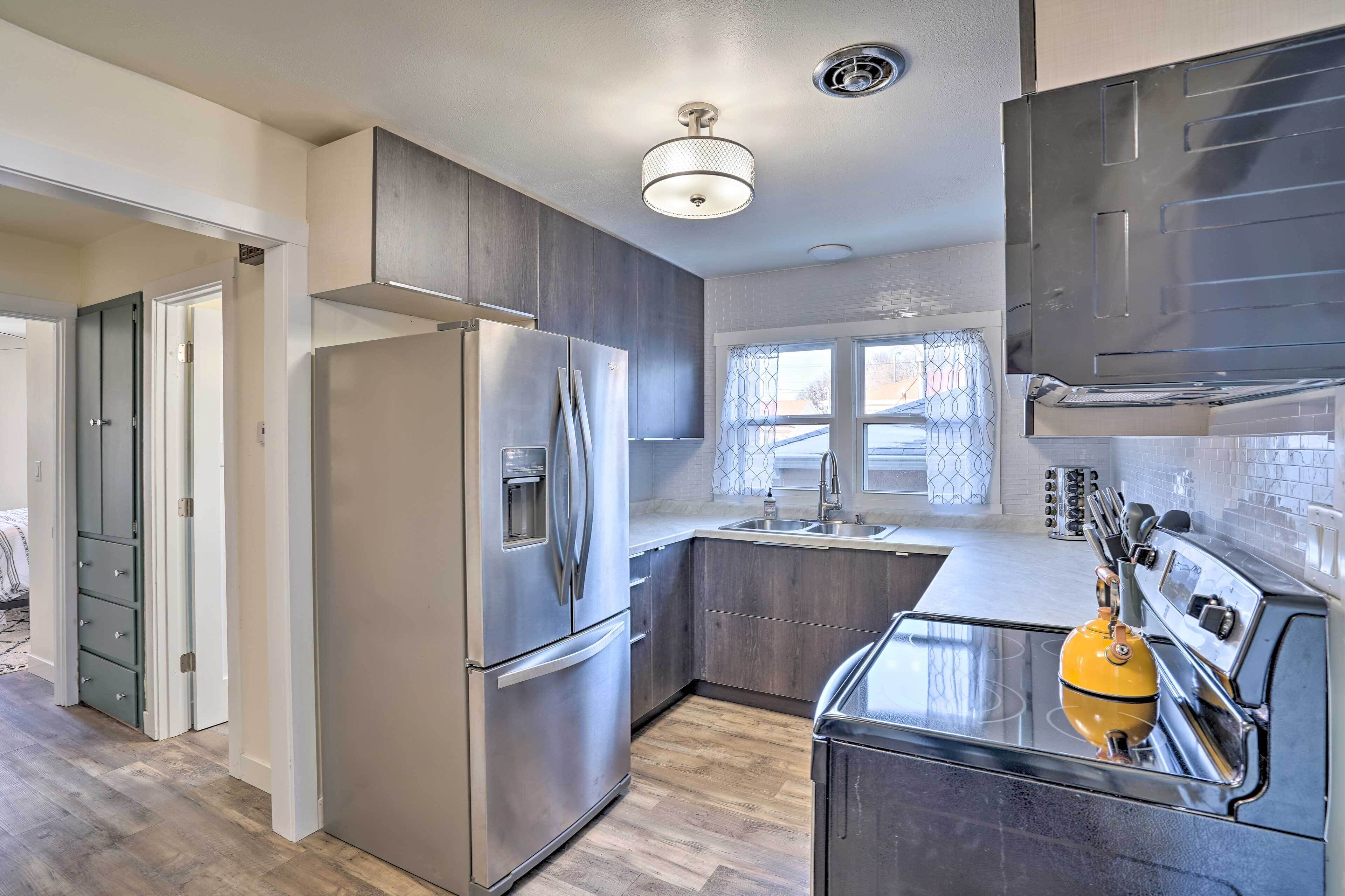 The spacious kitchen has everything to need to cook a meal like a boss. The kitchen in stocked with Emeril pots and pans, a Crock-pot, Keurig Machine, full sized fridge and a full sized stove/oven. Save some money dining in on delicious home cooked meals.