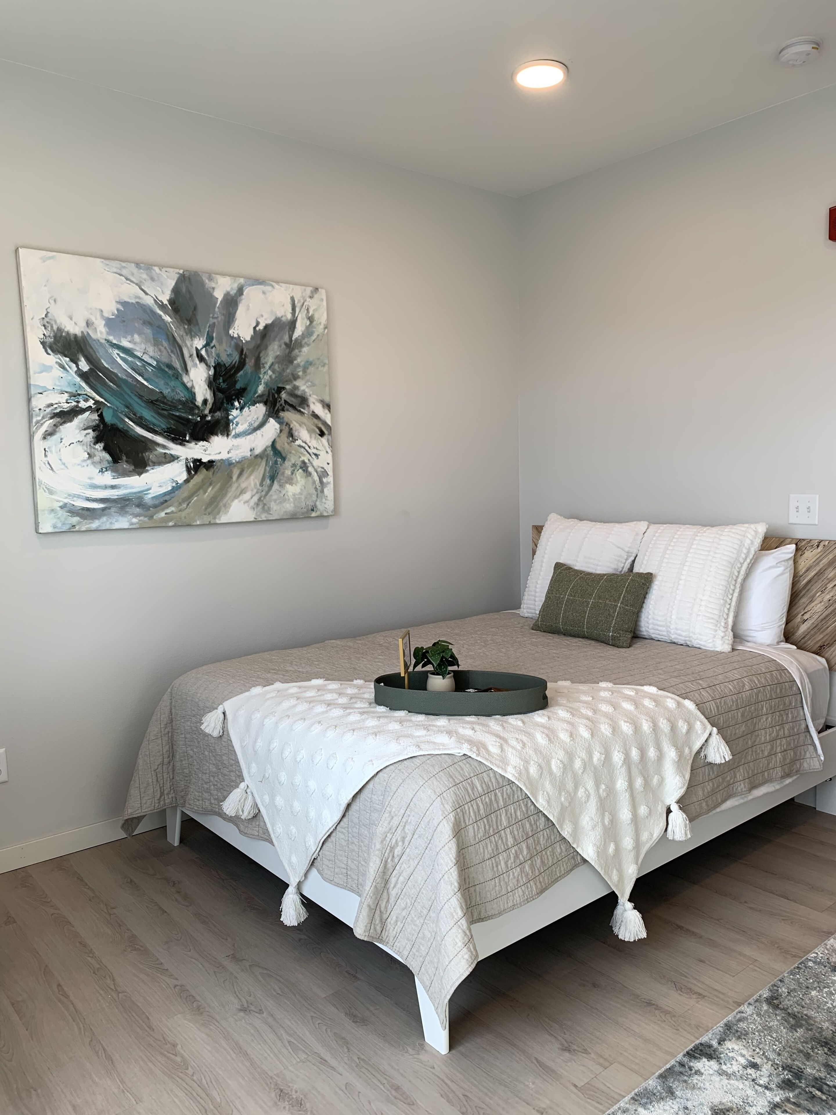 Into the bedroom we go! A resplendent queen-sized bed takes center stage, adorned in soothing, neutral hues that envelop the space in a cocoon of serenity. The bed, dressed in the embrace of gentle linens and pristine white sheets, extends an irresistible invitation to succumb to its allure, ready to guide you into a restorative slumber that knows no bounds.
