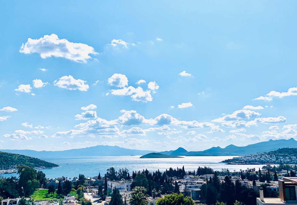 Panoramic views of the Aegean Sea await you in this apartment in one of the most beautiful bays of Bodrum. The apartment has unparalleled views and is located in a corner lot looking over not only the stunning Aegean see but also the lush green valley unique to Bitez. Located in a gated community with two gorgeous swimming pools and security; the apartment is completely remodeled with marble/granite bathroom, modern new furniture and flooring, panoramic windows and a spacious terrace.