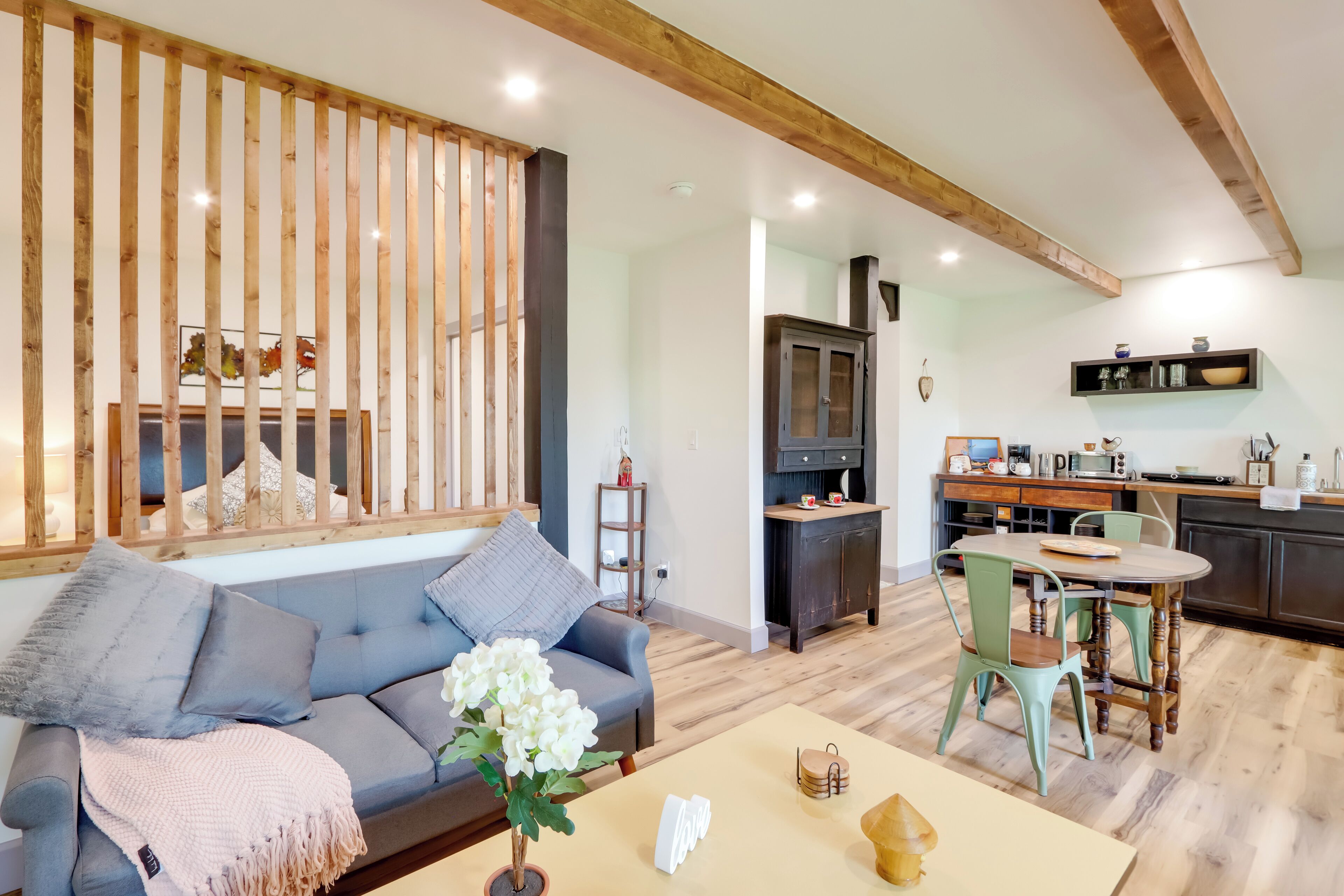 This downtown suite is completely updated and modernized from a recent renovation. Filled with warmth and modern style, this 1BR, 1BA suite features on an open floor plan with the bedroom and main living areas separated by double rolling barn doors. Professionally designed & decorated by the building's owner & your host, Nathan Fitts, who is known for is mountain modern designs and is responsible for some of the nicest homes in the North Georgia Mountains. The kitchen has been brought back to life highlighting the original exposed brick exterior walls which adds to the character and charm of this space. Open modern farmhouse style kitchen shelves and a large picture window boasts lots of natural light. Kitchen is fully equipped with a refrigerator & freezer, dishwasher, microwave, range and is fully equipped with all cooking supplies and utensils as well as accessories such as Keurig coffee maker with a variety of sweeteners & creamers, toaster oven, blender, mixer, baking tools, glassware & dishes, etc. Kitchen also is fully equipped and stocked serving as a wet bar providing wine glasses, martini glasses, champagne glasses, Moscow mule mugs, beer mugs, wine opener, cocktail shaker set & more. Bedroom features a king size bed with wall reading sconce lights and space features a designated workspace providing a desk and accessories for those who may need to plug in to work while visiting. The living room is focused on an electric fireplace and 55" smart TV with comfortable but modern style furniture including a sofa and accent chair with cube ottomans encouraging you to relax and put your feet up. The ensuite bathroom features a large walk in all glass subway tile shower with detachable shower rain head and for those who like space to spread out, wait until you see this walk-in style closet, you'll want to unpack and not go back home!