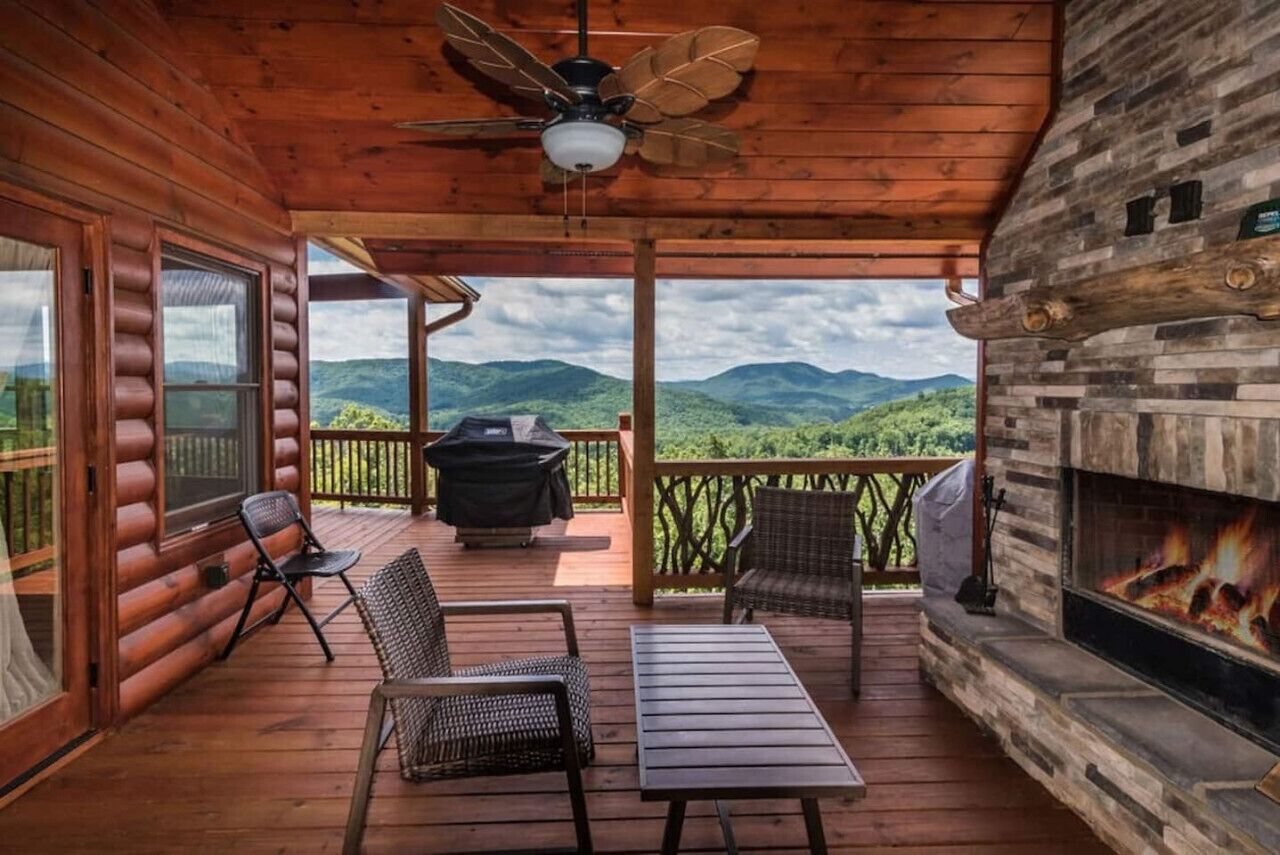 Perched in the mountains of North Georgia with a stunning mountain view, "Majestic" offers a private retreat just a short drive from the shops and restaurants of downtown Blue Ridge. This luxurious cabin boasts exquisite custom finishes, modern-rustic décor, and three bedrooms. The game room features a foosball table, while three fireplaces—one on the deck, one in the living room, and one in the downstairs game room—create a cozy atmosphere. Unwind in hot tub, taking the breathtaking mountain.